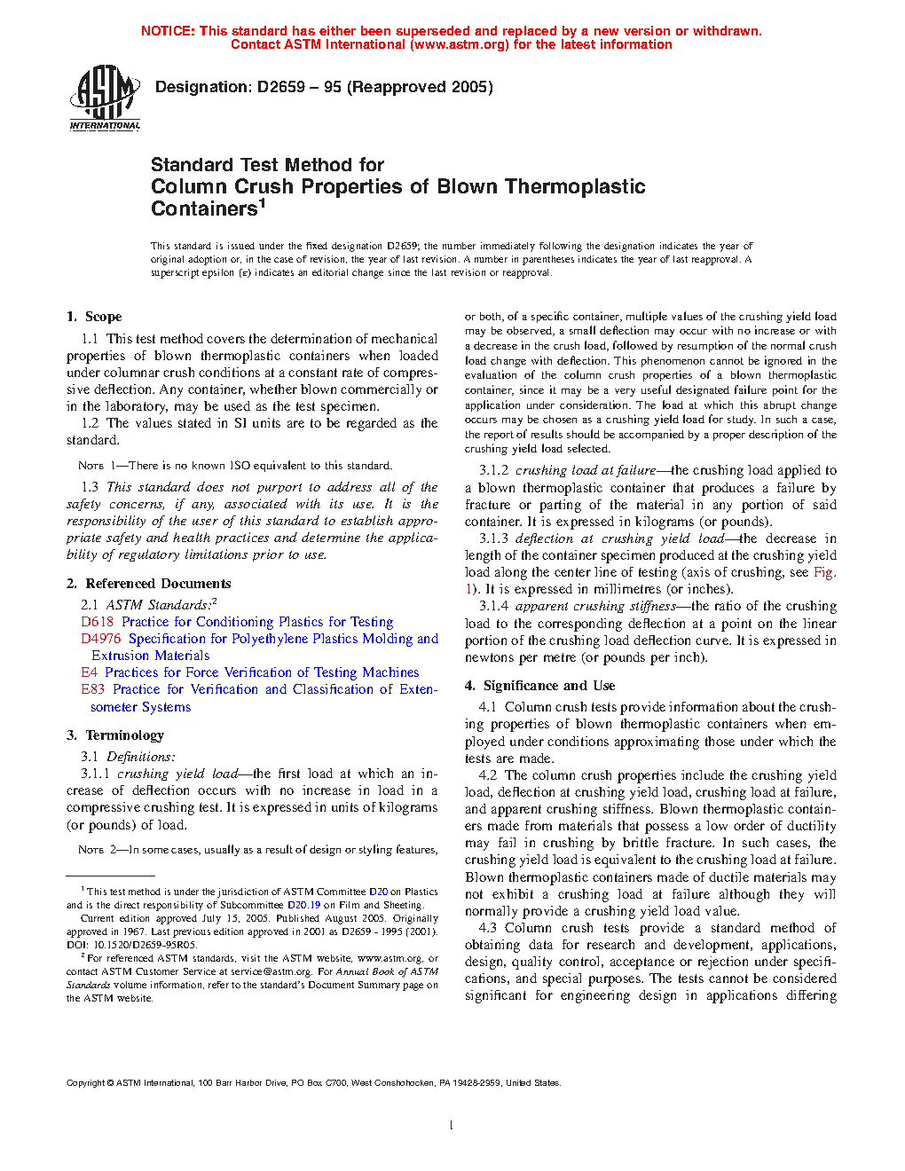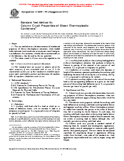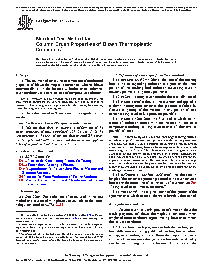 1.1 This test method covers the determination of mechanical properties of blown thermoplastic containers, whether blown commercially or in the laboratory, loaded under columnar crush conditions at a constant rate of compressive deflection.