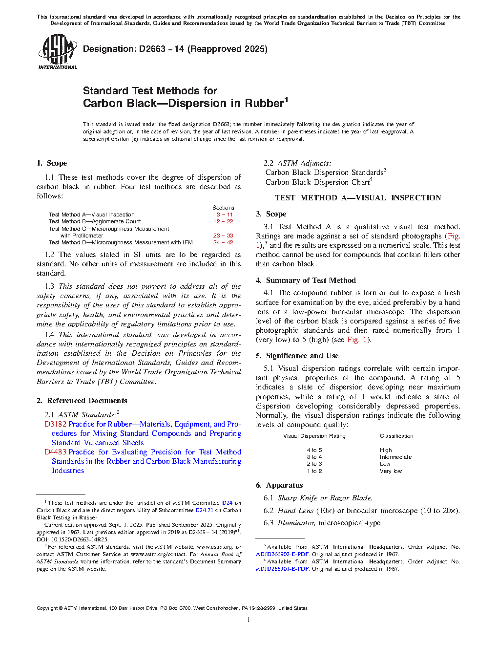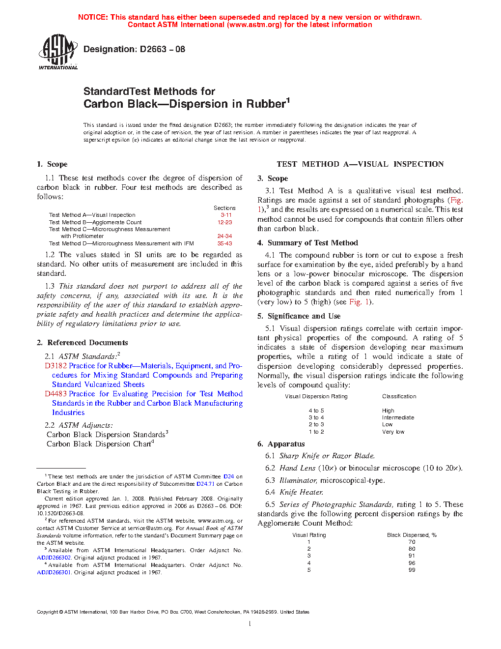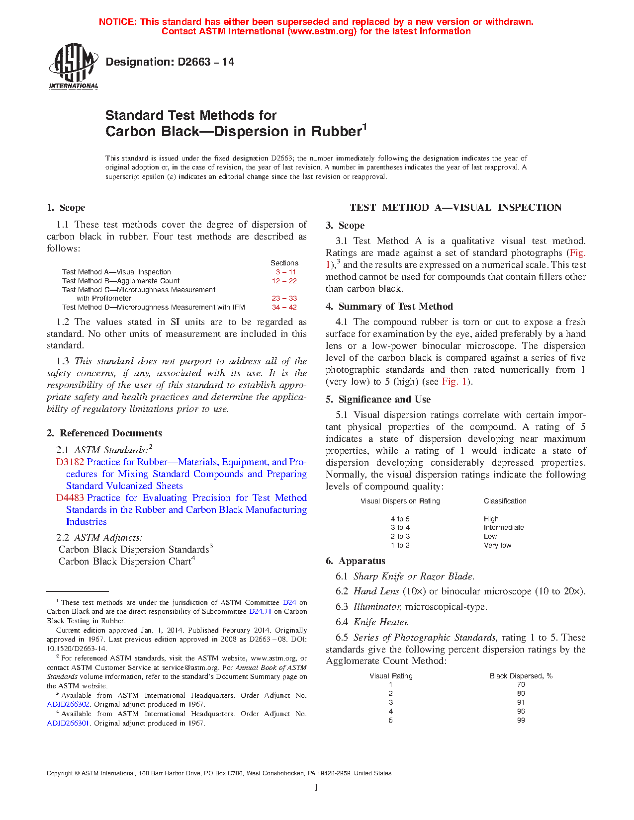 1.1 These test methods cover the degree of dispersion of carbon black in rubber. Four test methods are described as follows: