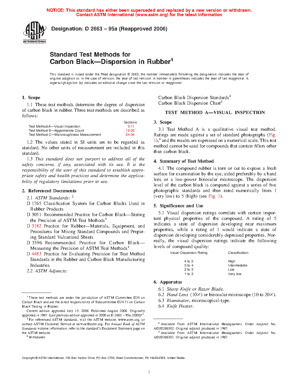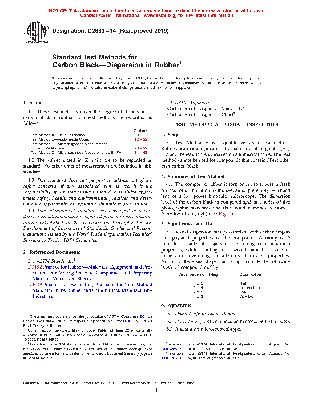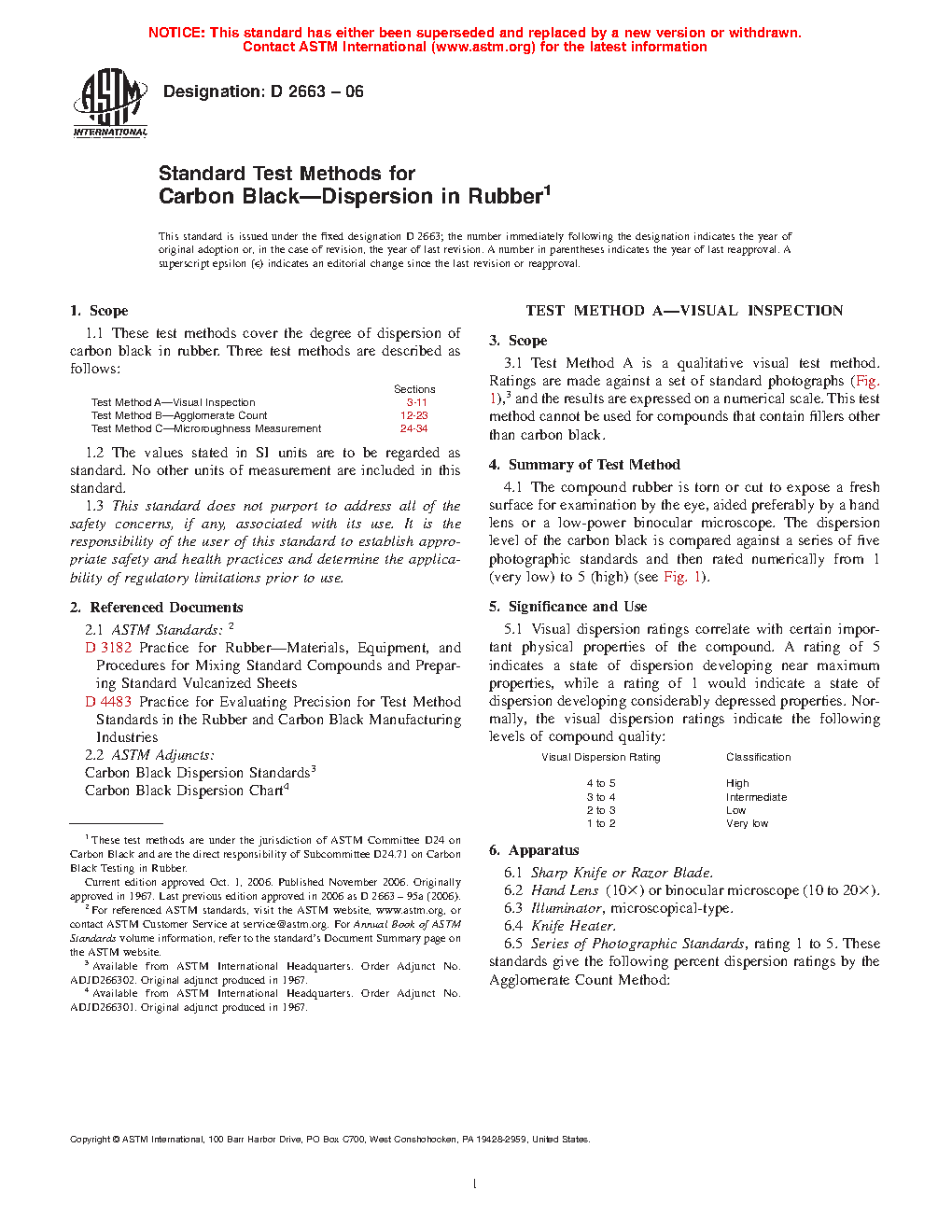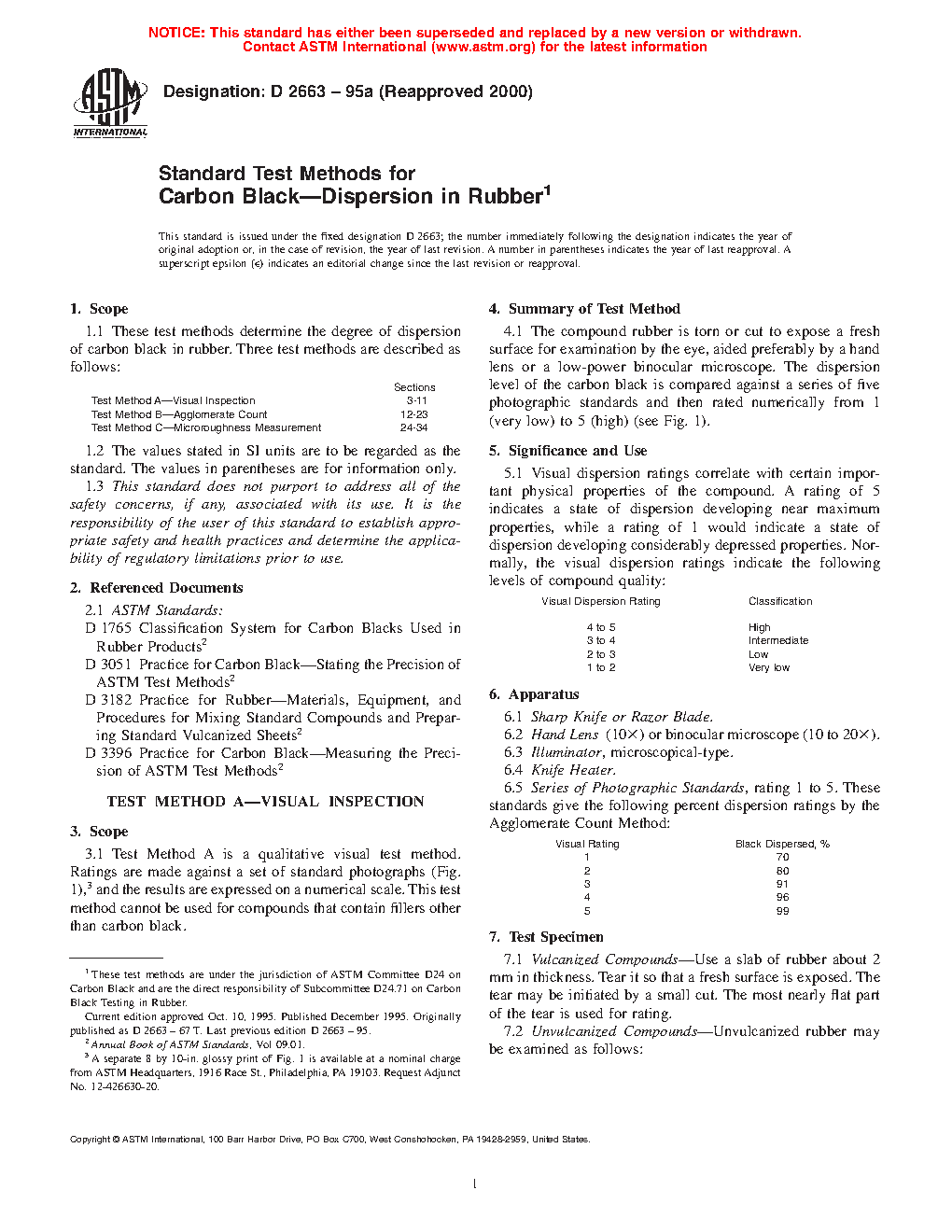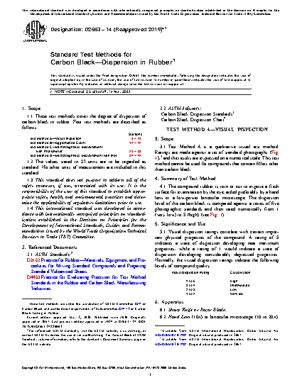 1.1 These test methods cover the degree of dispersion of carbon black in rubber. Four test methods are described as follows: