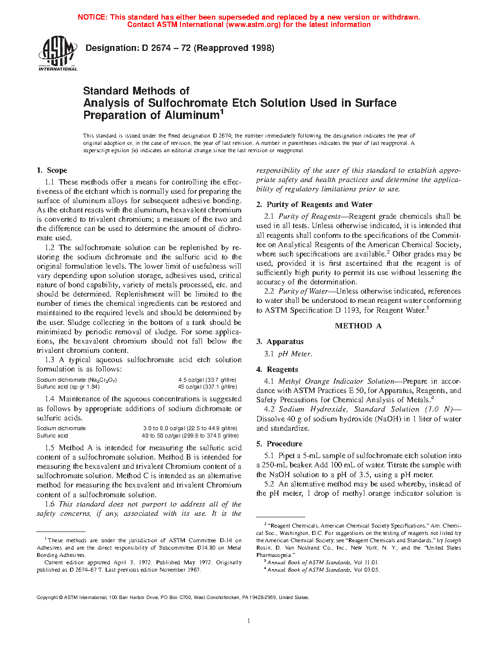 1.2 The sulfochromate solution can be replenished by restoring the sodium dichromate and the sulfuric acid to the original formulation levels. The lower limit of usefulness will vary depending upon solution storage, adhesives used, critical nature of bond capability, variety of metals processed, etc. and should be determined. Replenishment will be limited to the number of times the chemical ingredients can be restored and maintained to the required levels and should be determined by the user. Sludge collecting in the bottom of a tank should be minimized by periodic removal of sludge. For some applications, the hexavalent chromium should not fall below the trivalent chromium content.