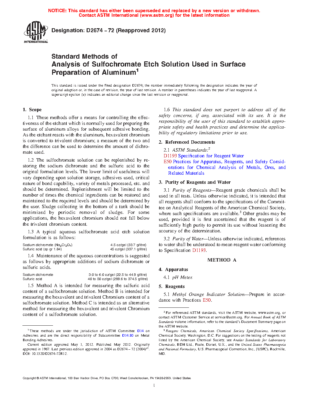 1.5 Method A is intended for measuring the sulfuric acid content of a sulfochromate solution. Method B is intended for measuring the hexavalent and trivalent Chromium content of a sulfochromate solution. Method C is intended as an alternative method for measuring the hexavalent and trivalent Chromium content of a sulfochromate solution.