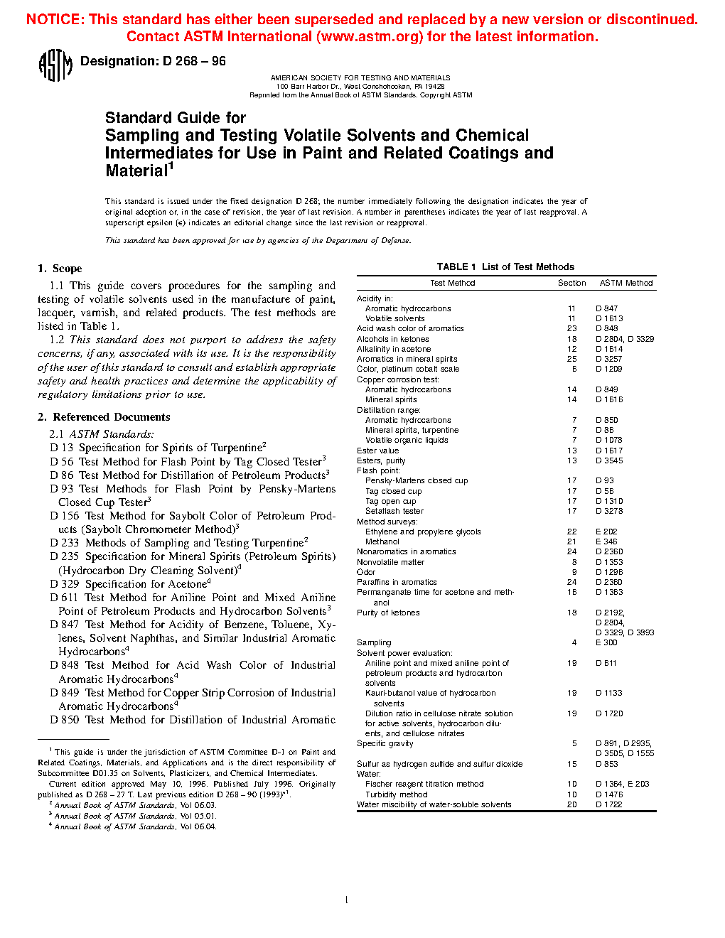 1.1 This guide covers procedures for the sampling and testing of volatile solvents used in the manufacture of paint, lacquer, varnish, and related products. The test methods are listed in Table 1.
