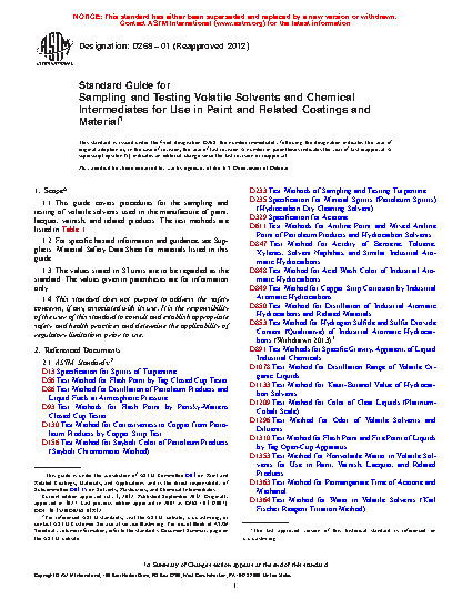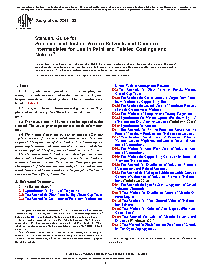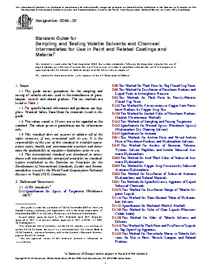 1.1 This guide covers procedures for the sampling and testing of volatile solvents used in the manufacture of paint, lacquer, varnish, and related products. The test methods are listed in Table 1.