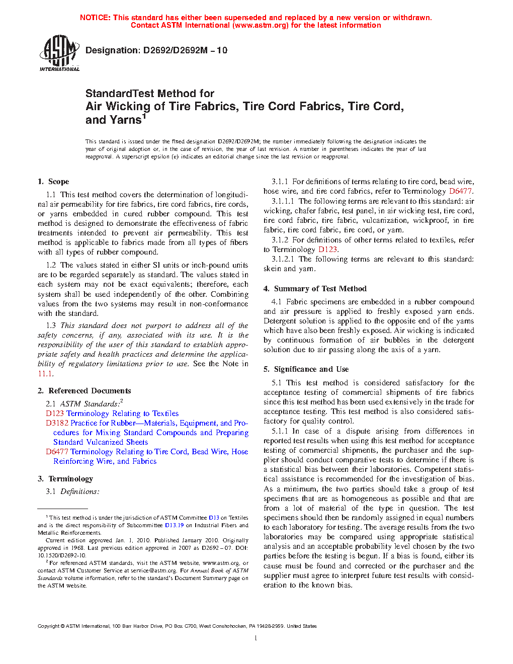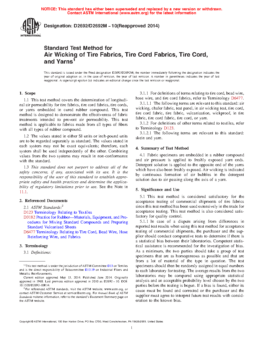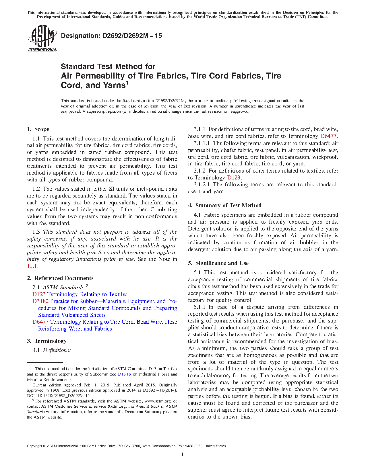 1.1 This test method covers the determination of longitudinal air permeability for tire fabrics, tire cord fabrics, tire cords, or yarns embedded in cured rubber compound. This test method is designed to demonstrate the effectiveness of fabric treatments intended to prevent air permeability. This test method is applicable to fabrics made from all types of fibers with all types of rubber compound.