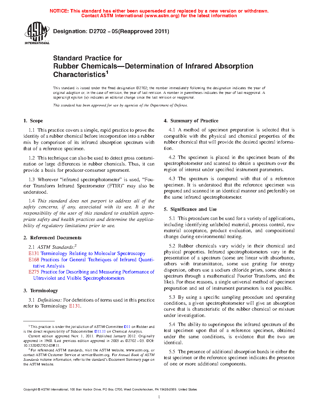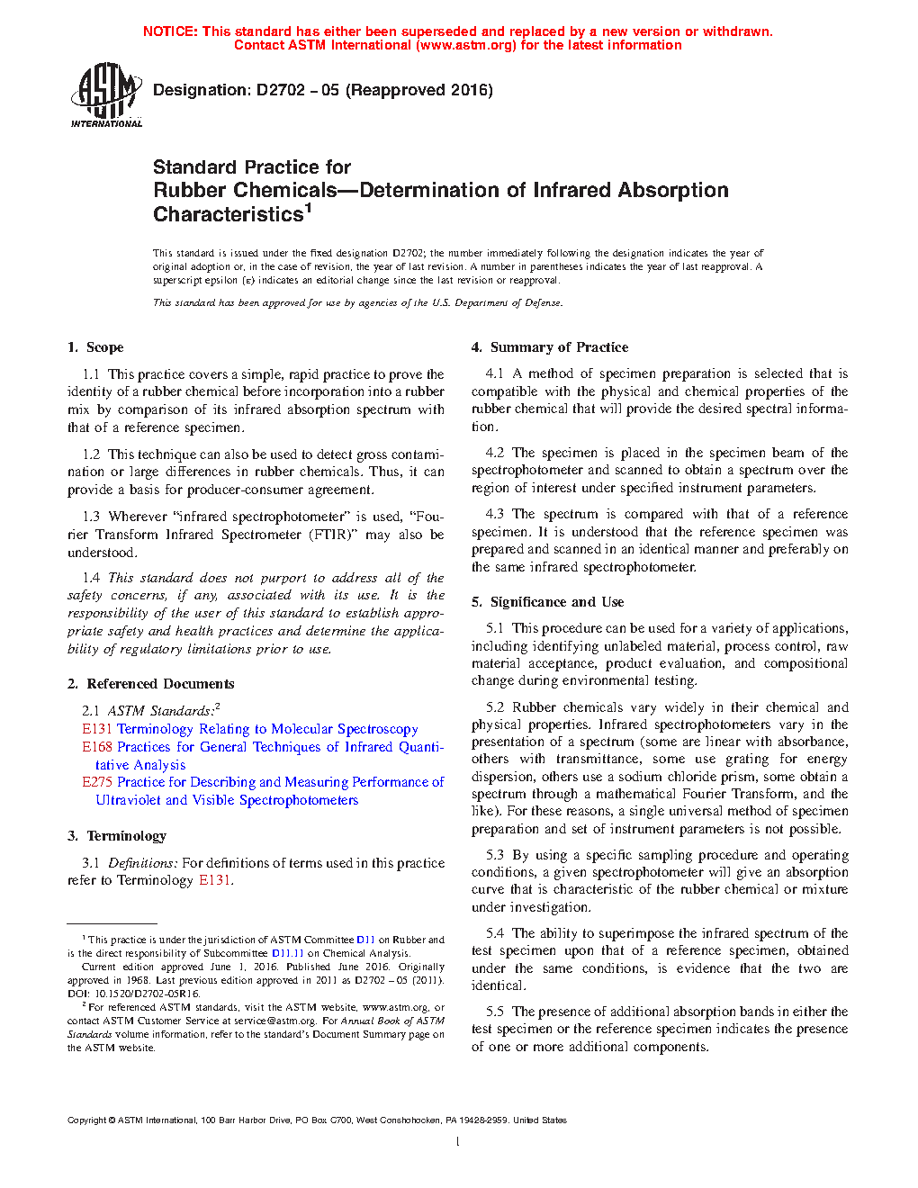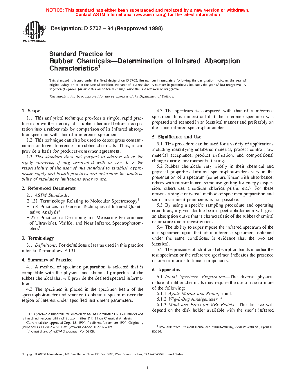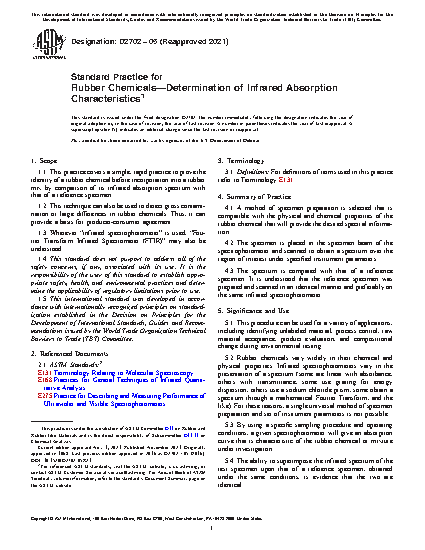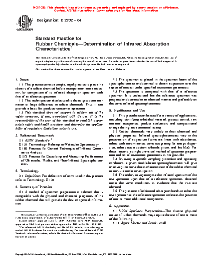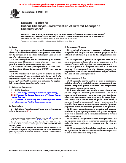 1.1 This practice covers a simple, rapid practice to prove the identity of a rubber chemical before incorporation into a rubber mix by comparison of its infrared absorption spectrum with that of a reference specimen.