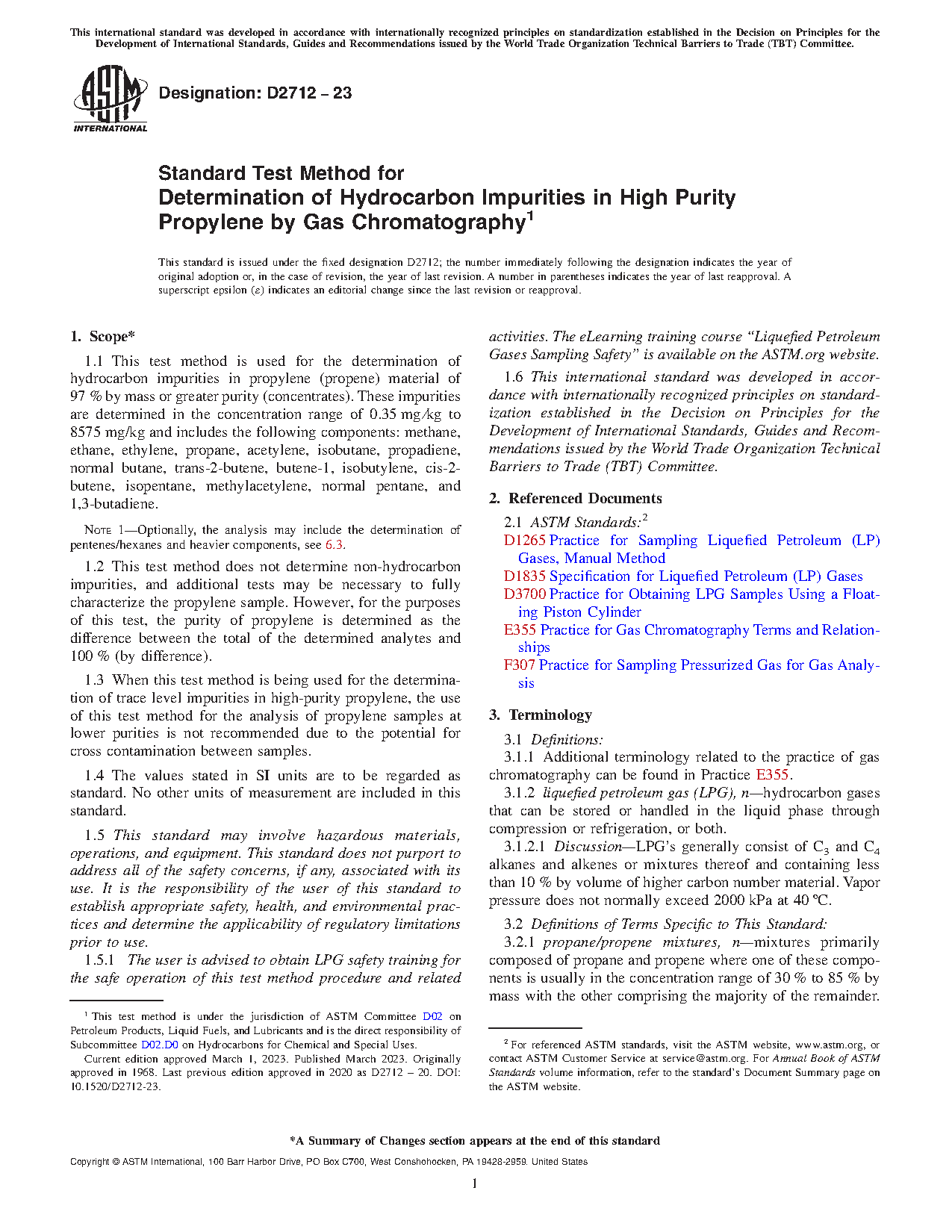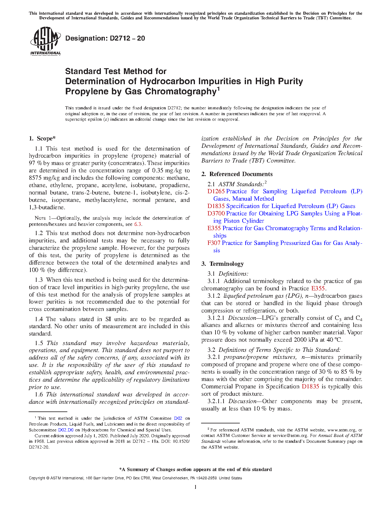 1.2 This test method does not determine non-hydrocarbon impurities, and additional tests may be necessary to fully characterize the propylene sample. However, for the purposes of this test, the purity of propylene is determined as the difference between the total of the determined analytes and 100 % (by difference).