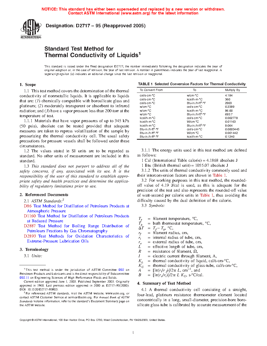 1.1 This test method covers the determination of the thermal conductivity of nonmetallic liquids. It is applicable to liquids that are: (1) chemically compatible with borosilicate glass and platinum; (2) moderately transparent or absorbent to infrared radiation; and (3) have a vapor pressure less than 200 torr at the temperature of test.