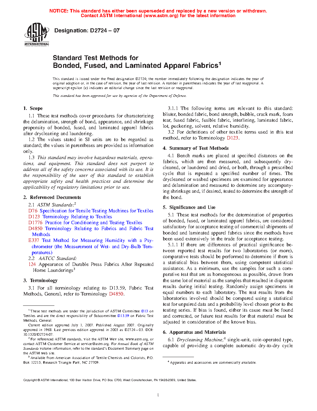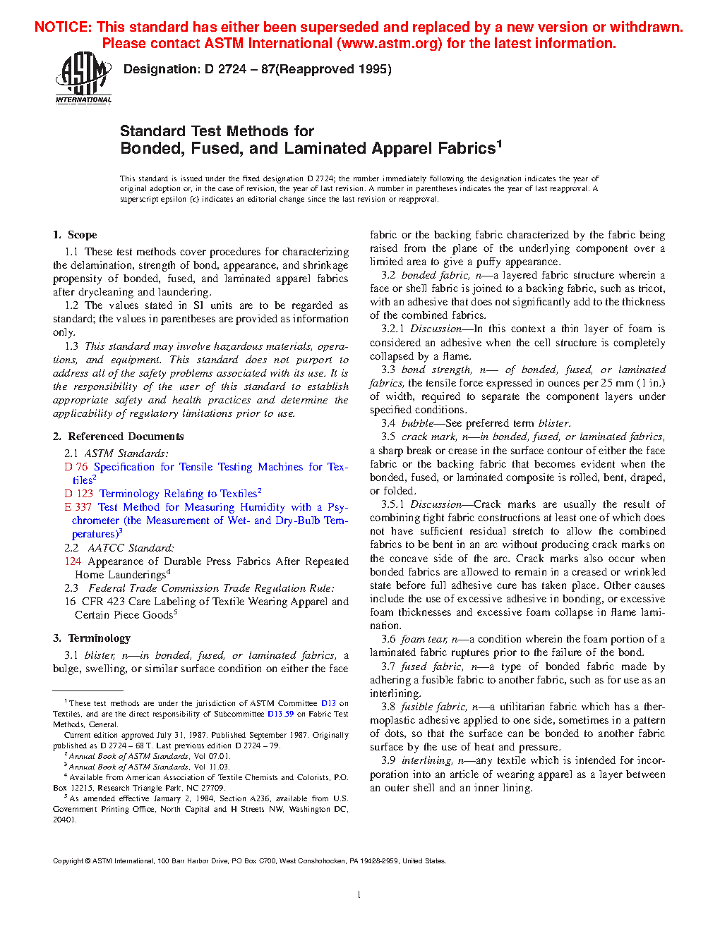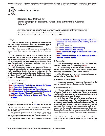 1.1 These test methods cover procedures for characterizing the delamination, strength of bond, appearance, and shrinkage propensity of bonded, fused, and laminated apparel fabrics after drycleaning and laundering.