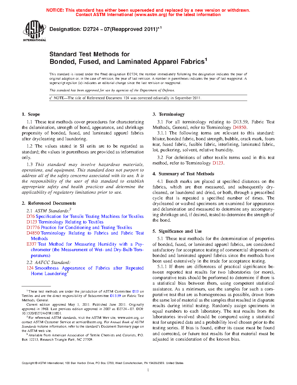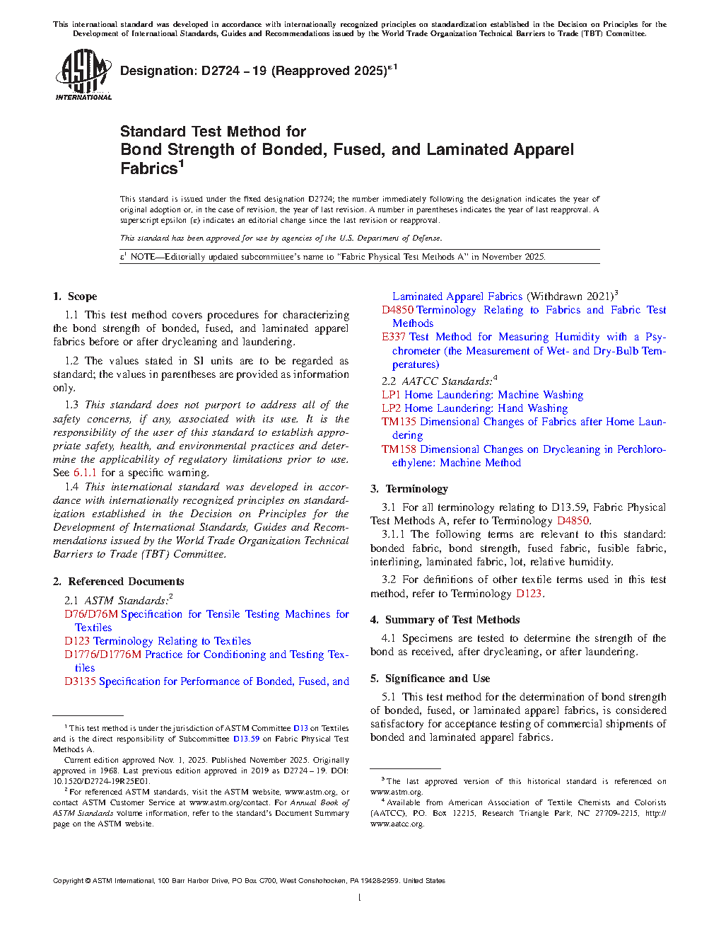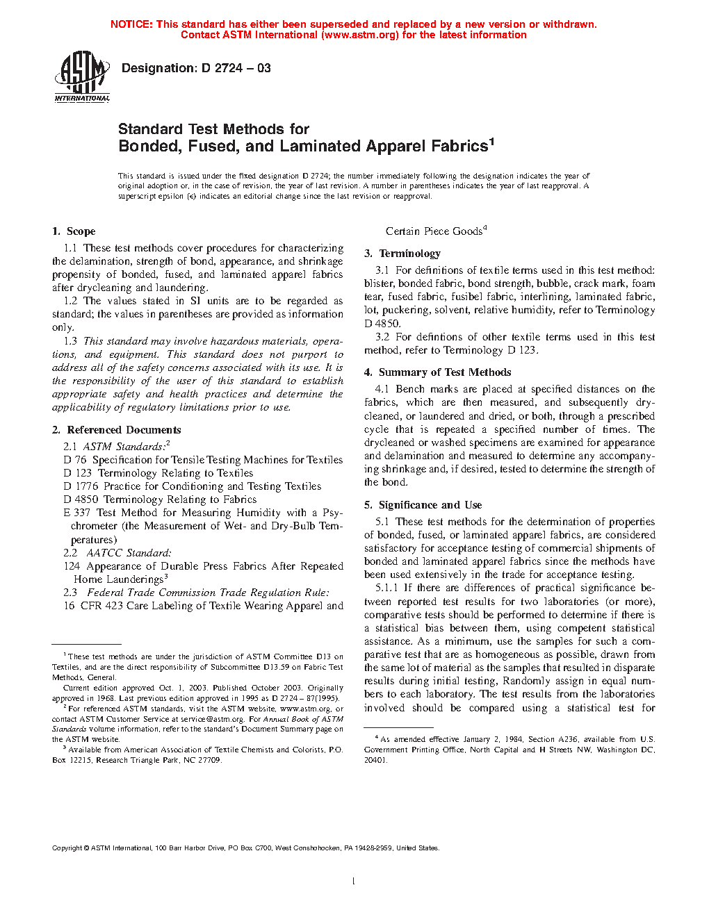 These test methods for the determination of properties of bonded, fused, or laminated apparel fabrics, are considered satisfactory for acceptance testing of commercial shipments of bonded and laminated apparel fabrics since the methods have been used extensively in the trade for acceptance testing.