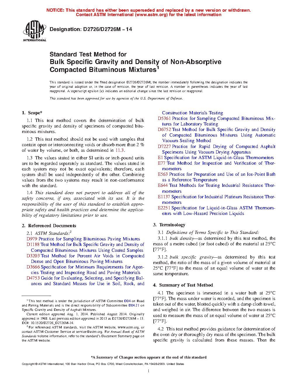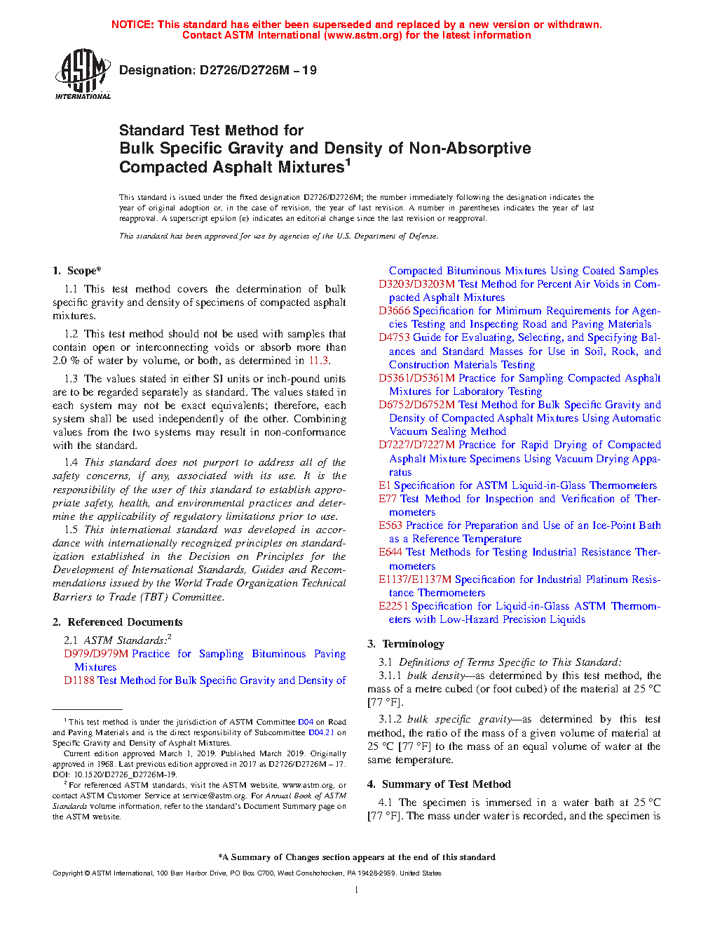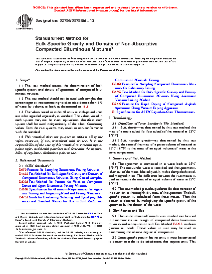 1.1 This test method covers the determination of bulk specific gravity and density of specimens of compacted bituminous mixtures.