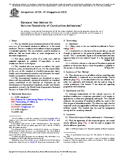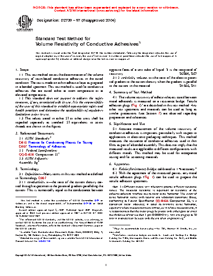 1.1 This test method covers the determination of the volume resistivity of resin-based conductive adhesives in the cured condition. The test is made on a thin adhesive layer as prepared in a bonded specimen. This test method is used for conductive adhesives that are cured either at room temperature or at elevated temperatures.