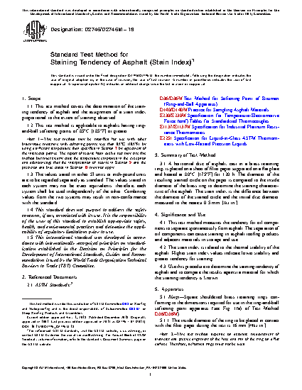 1.1 This test method covers the determination of the staining tendency of asphalt and the assignment of a stain index proportional to the extent of staining observed.