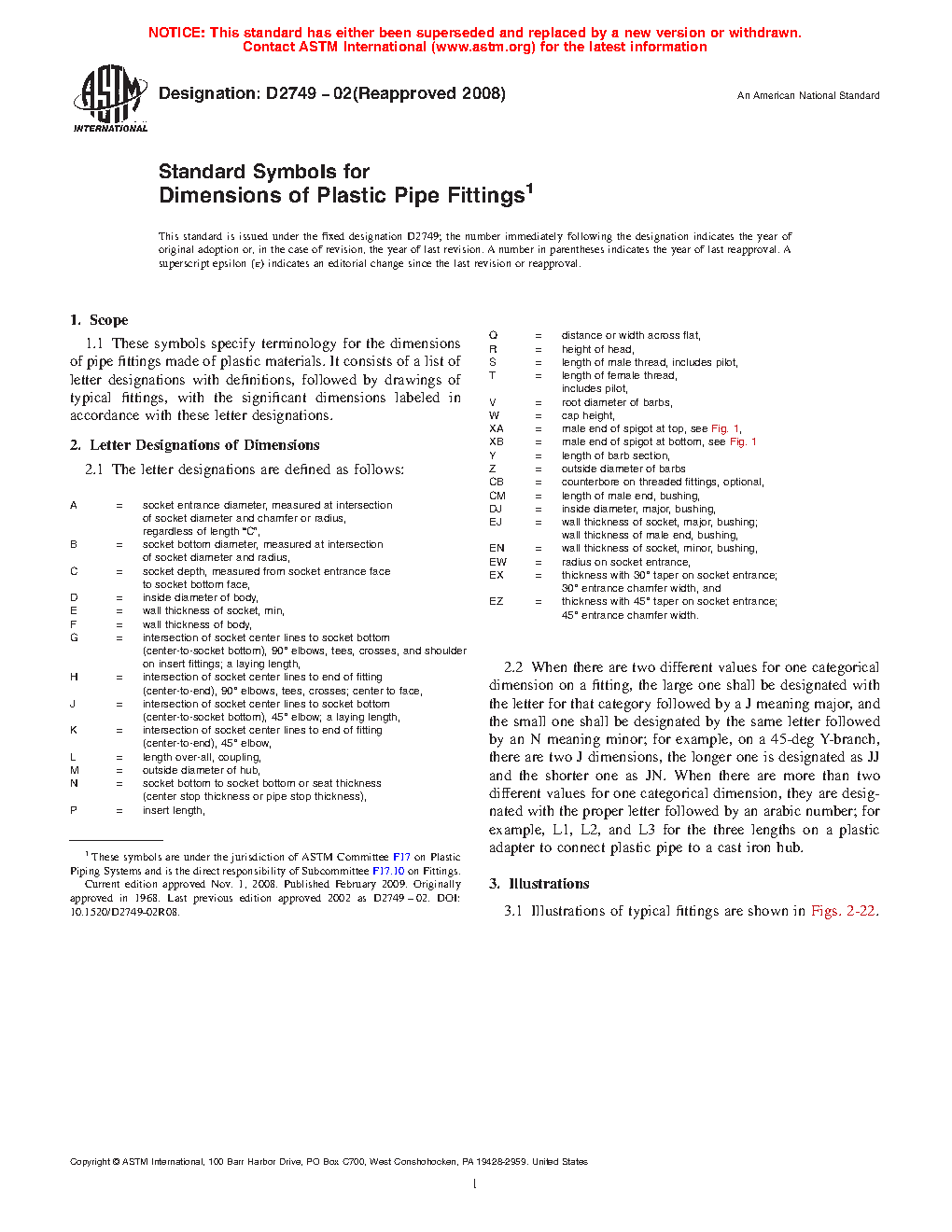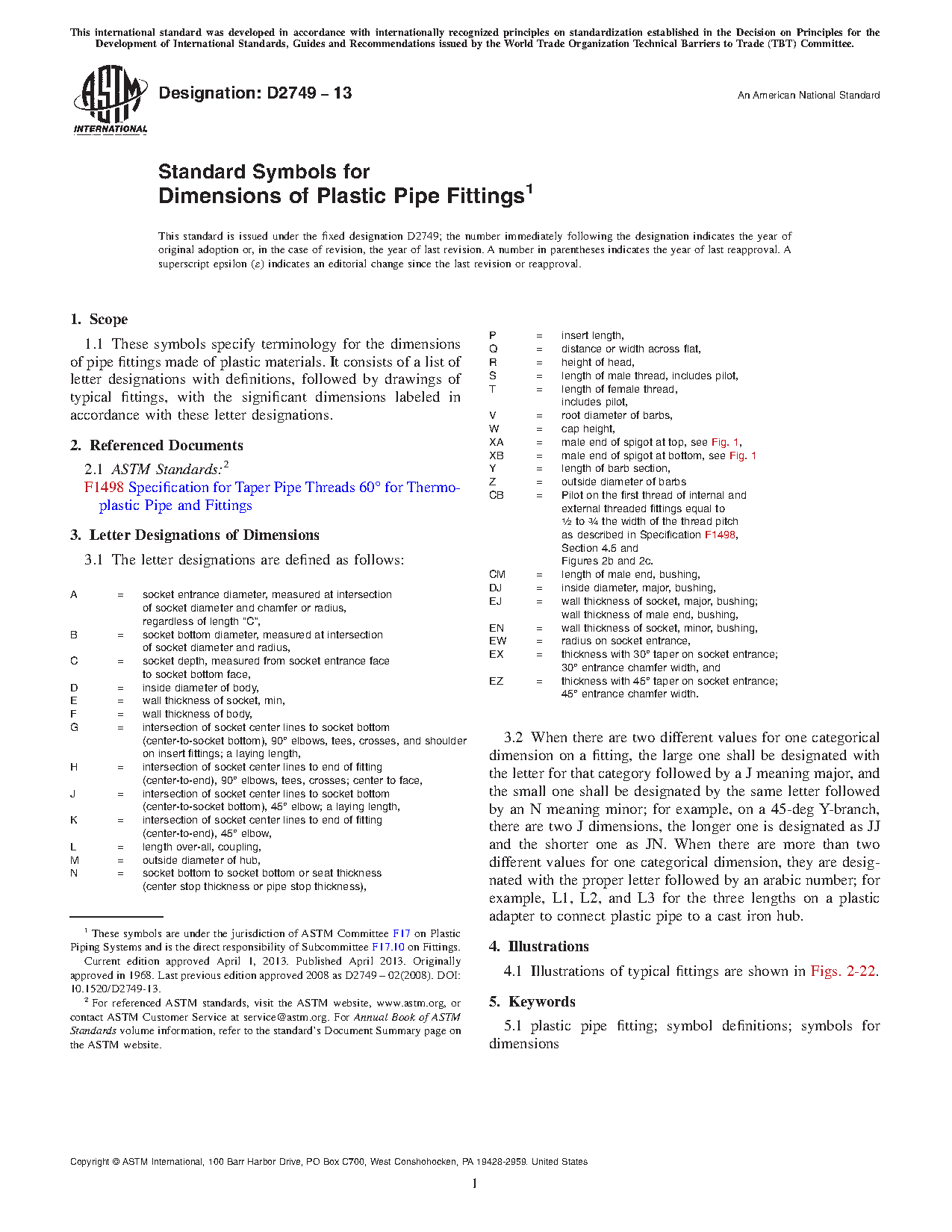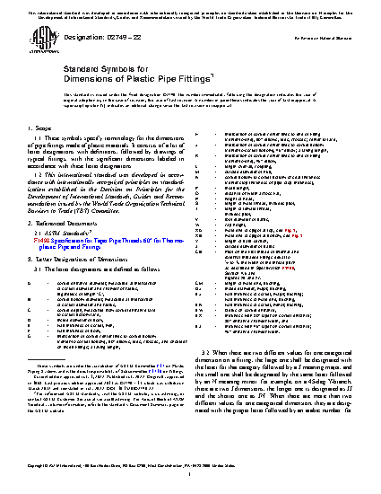 1.1 These symbols specify terminology for the dimensions of pipe fittings made of plastic materials. It consists of a list of letter designations with definitions, followed by drawings of typical fittings, with the significant dimensions labeled in accordance with these letter designations.