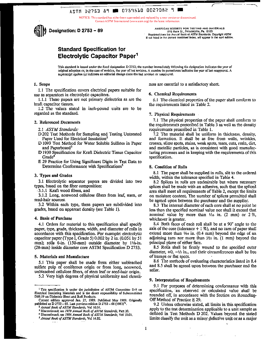 Specification for Electrolytic Capacitor Paper (Withdrawn 1993)