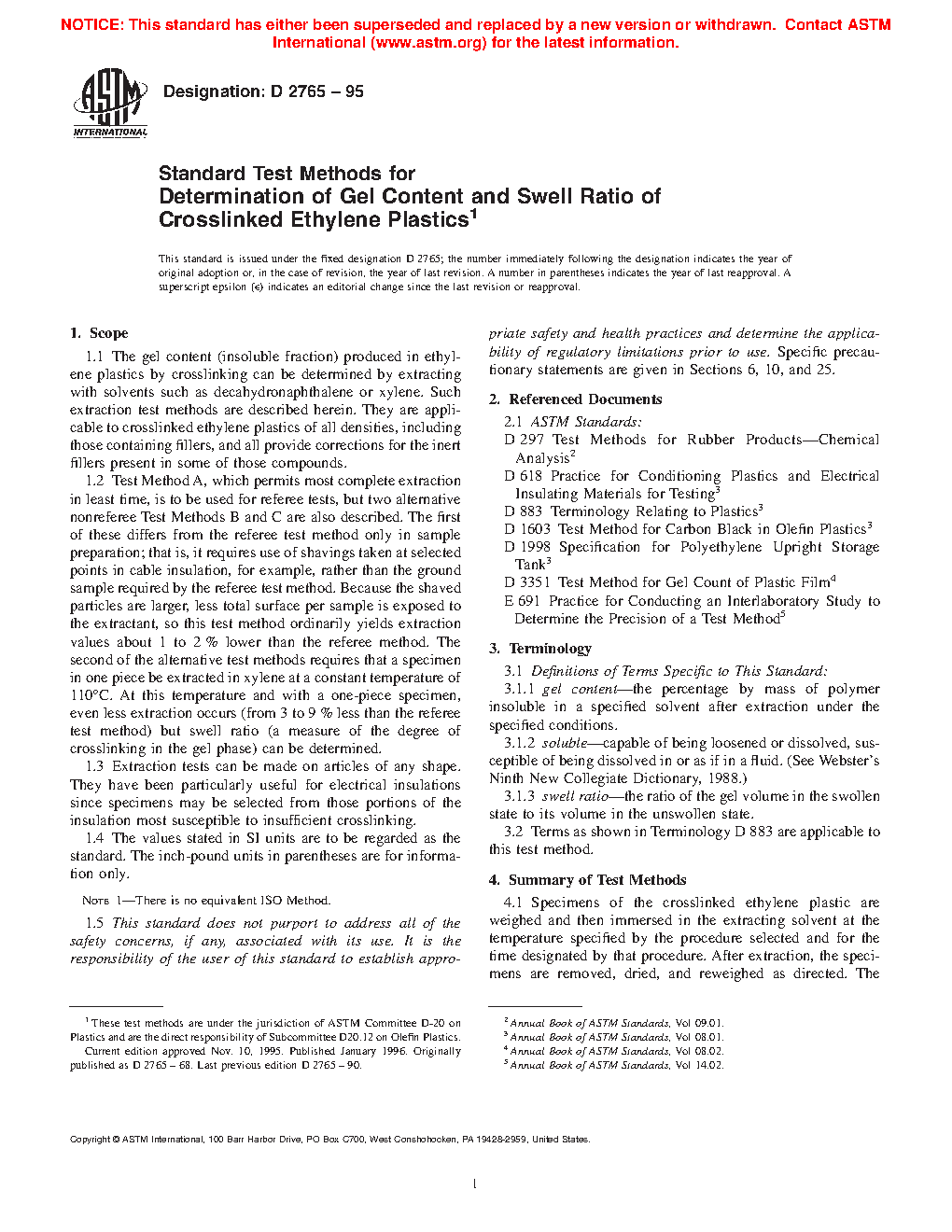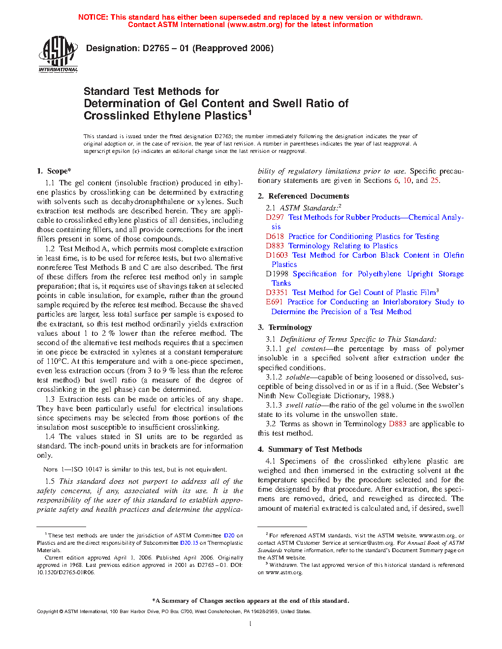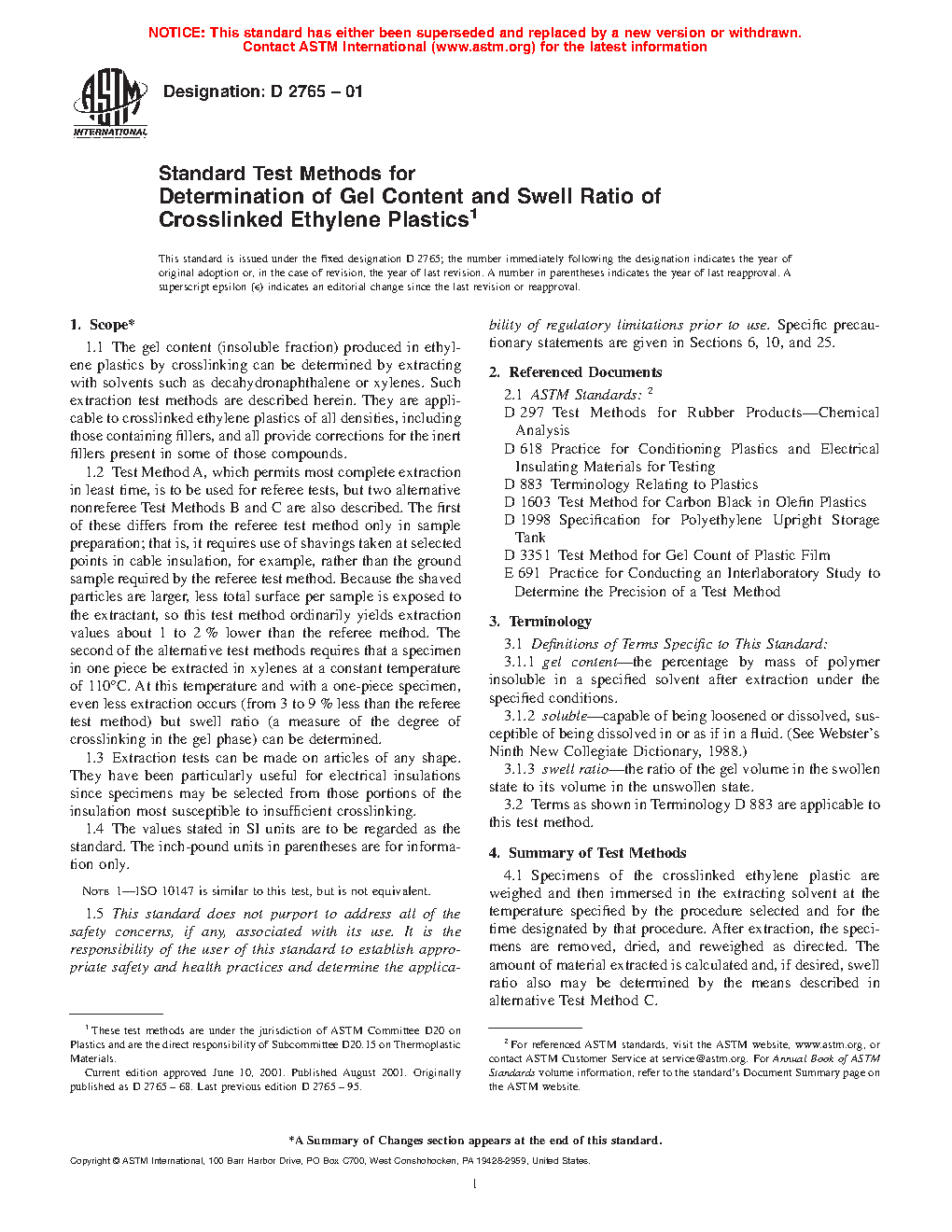 1.2 Test Method A, which permits most complete extraction in least time, is to be used for referee tests, but two alternative nonreferee Test Methods B and C are also described. The first of these differs from the referee test method only in sample preparation; that is, it requires use of shavings taken at selected points in cable insulation, for example, rather than the ground sample required by the referee test method. Because the shaved particles are larger, less total surface per sample is exposed to the extractant, so this test method ordinarily yields extraction values about 1 to 2 % lower than the referee method. The second of the alternative test methods requires that a specimen in one piece be extracted in xylenes at a constant temperature of 110C. At this temperature and with a one-piece specimen, even less extraction occurs (from 3 to 9 % less than the referee test method) but swell ratio (a measure of the degree of crosslinking in the gel phase) can be determined.