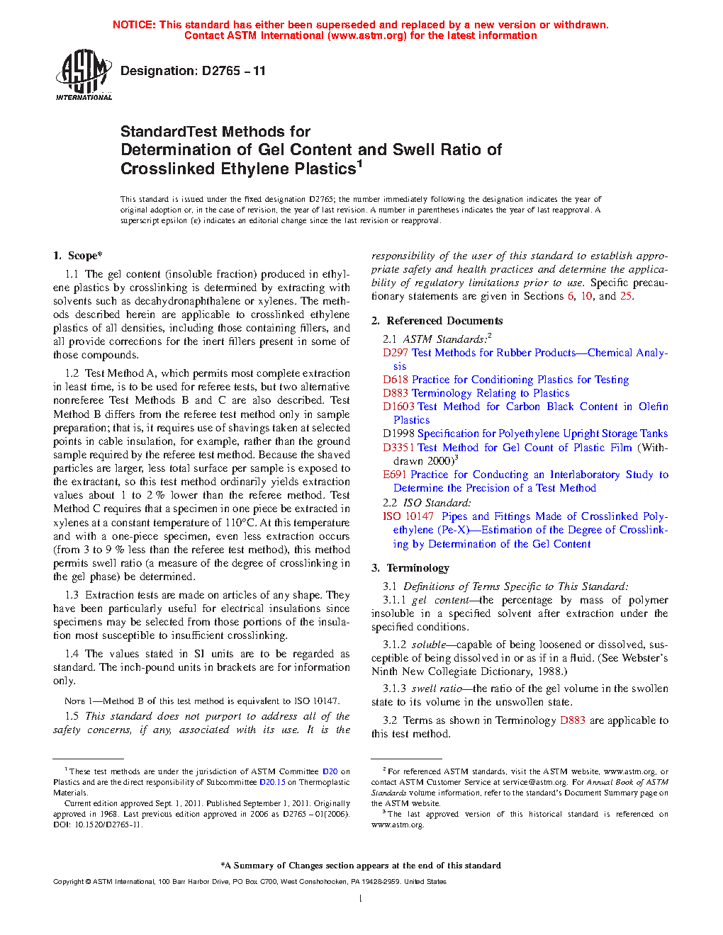 1.1 The gel content (insoluble fraction) produced in ethylene plastics by crosslinking can be determined by extracting with solvents such as decahydronaphthalene or xylenes. Such extraction test methods are described herein. They are applicable to crosslinked ethylene plastics of all densities, including those containing fillers, and all provide corrections for the inert fillers present in some of those compounds.