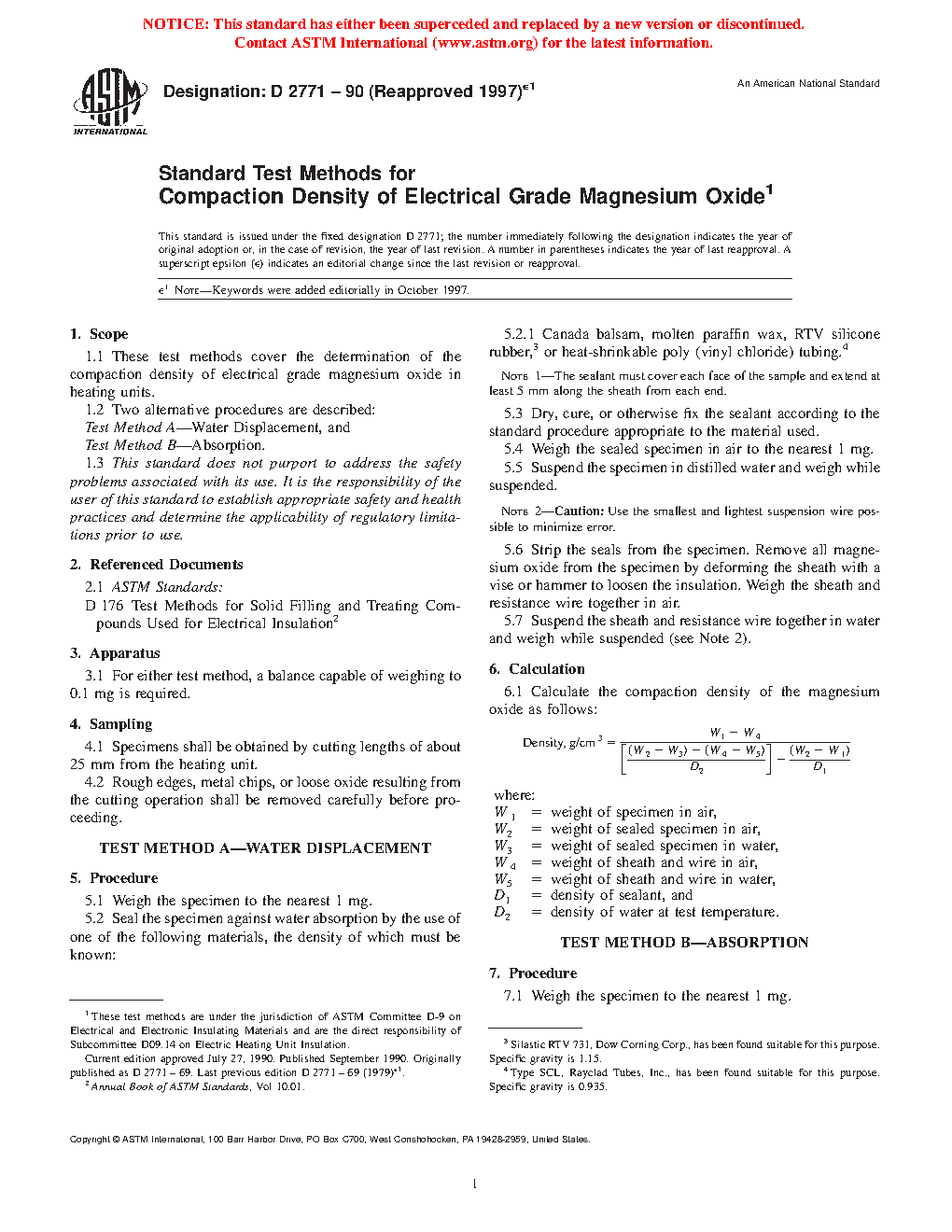 Standard Test Methods for Compaction Density of Electrical Grade Magnesium Oxide (Withdrawn 2003)