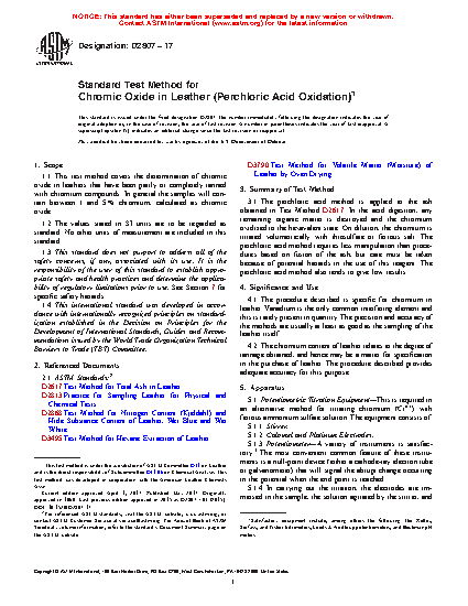 1.1 This test method covers the determination of chromic oxide in leathers that have been partly or completely tanned with chromium compounds. In general the samples will contain between 1 and 5 % chromium, calculated as chromic oxide.