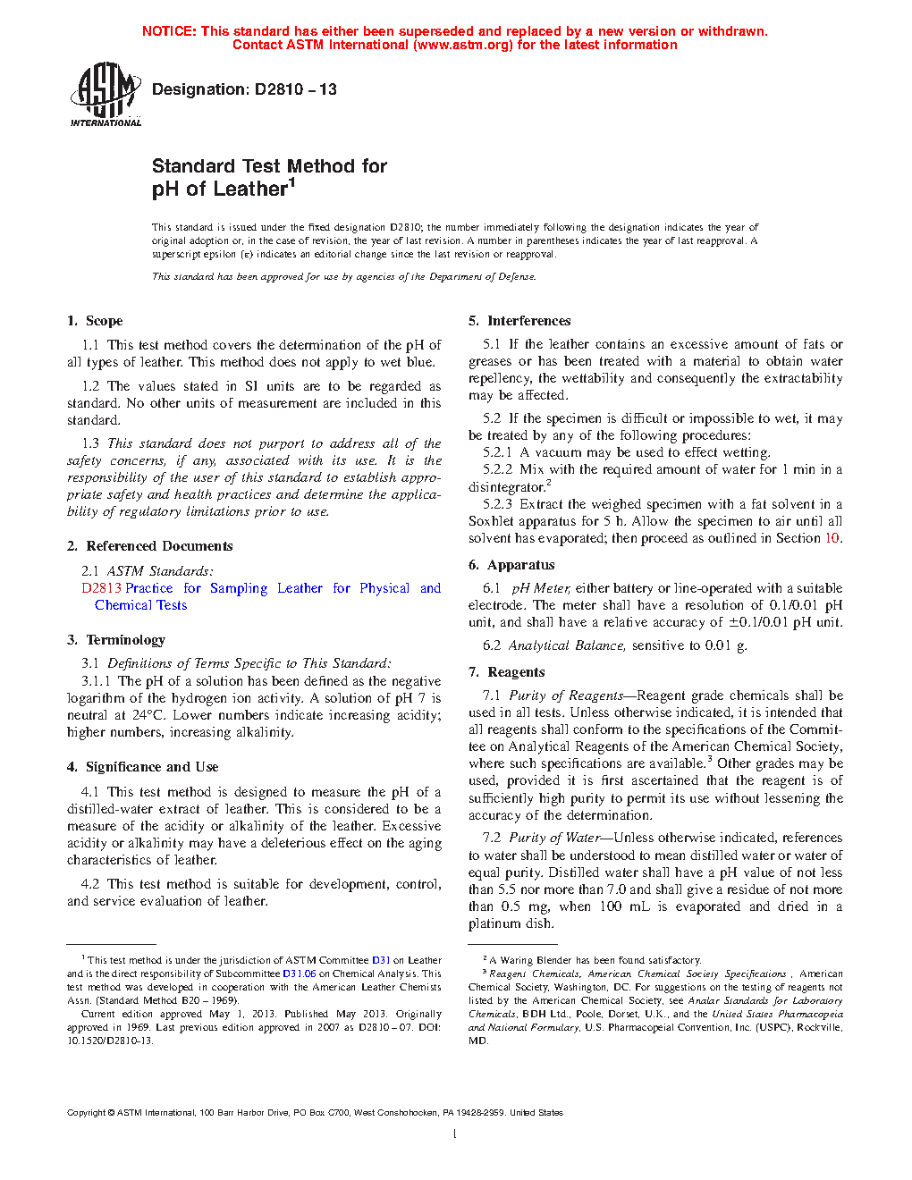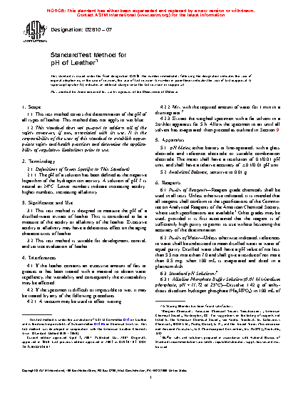1.1 This test method covers the determination of the pH of all types of leather. This method does not apply to wet blue or wet white.