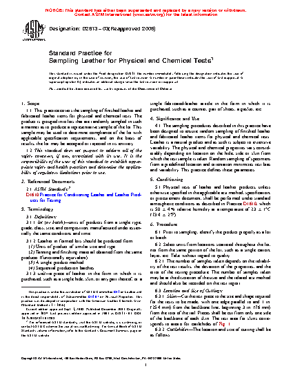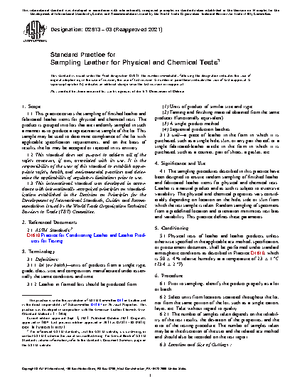 1.1 This practice covers the sampling of finished leather and fabricated leather items for physical and chemical tests. The product is grouped into lots that are randomly sampled in such a manner as to produce a representative sample of the lot. This sample may be used to determine compliance of the lot with applicable specification requirements, and on the basis of results, the lot may be accepted or rejected in its entirety.