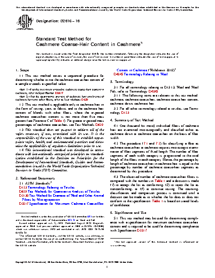 1.2 This test method is applicable only to cashmere hair in the form of roving, yarn, or fabric, and to the cashmere hair content of blends with other fibers, where the expected cashmere coarse-hair content is not more than five mass percent (see Footnote C of Table 1). For greater expected mass percentages of cashmere coarse-hair, see Test Methods D629.