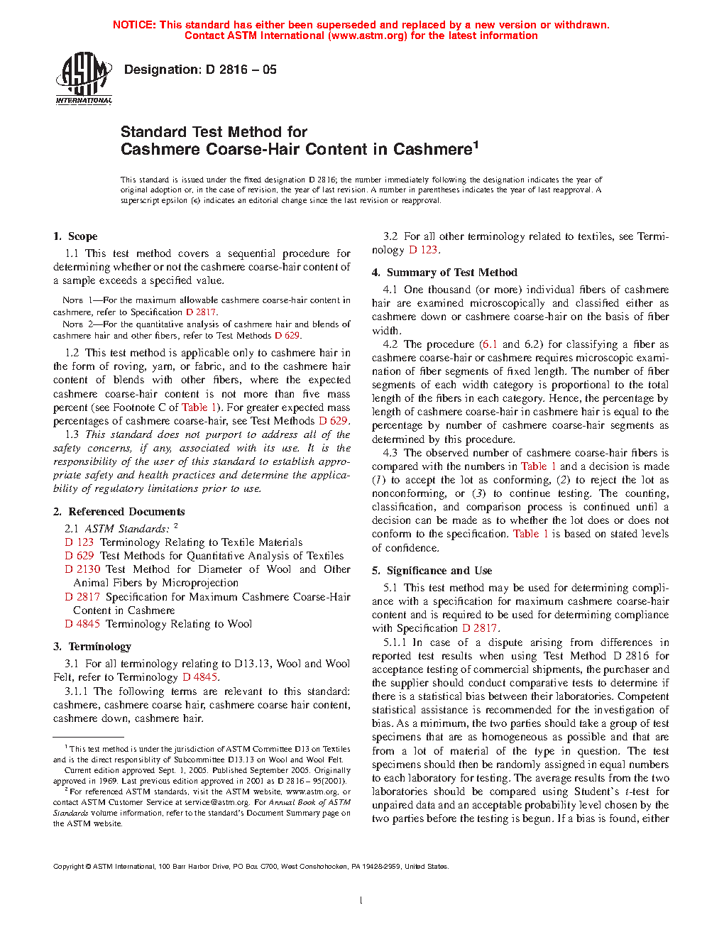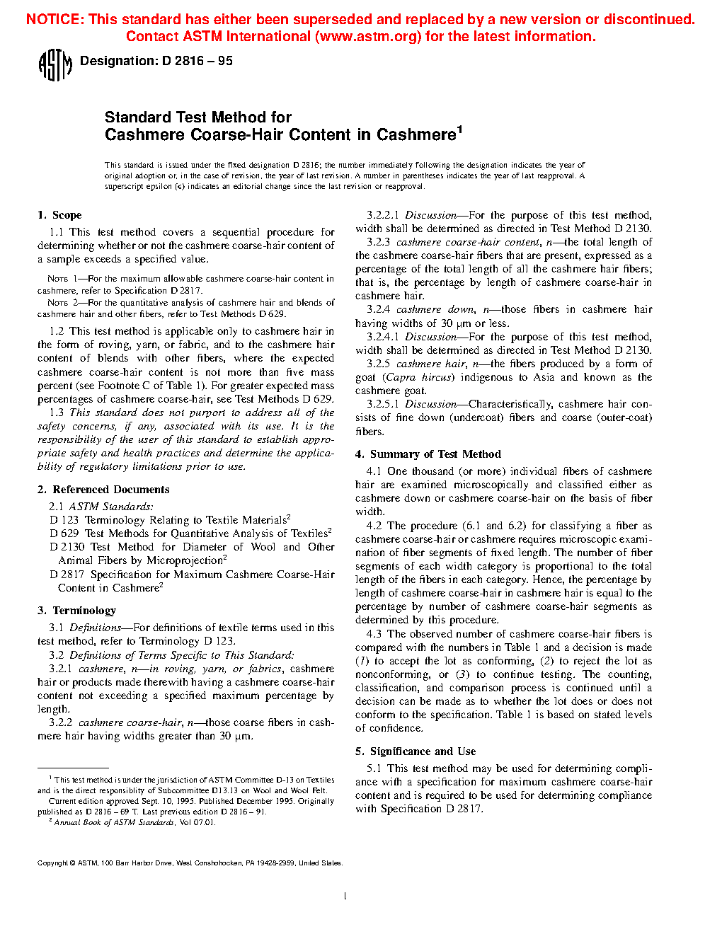 Note 1: For the maximum allowable cashmere coarse-hair content in cashmere, refer to Specification D2817.