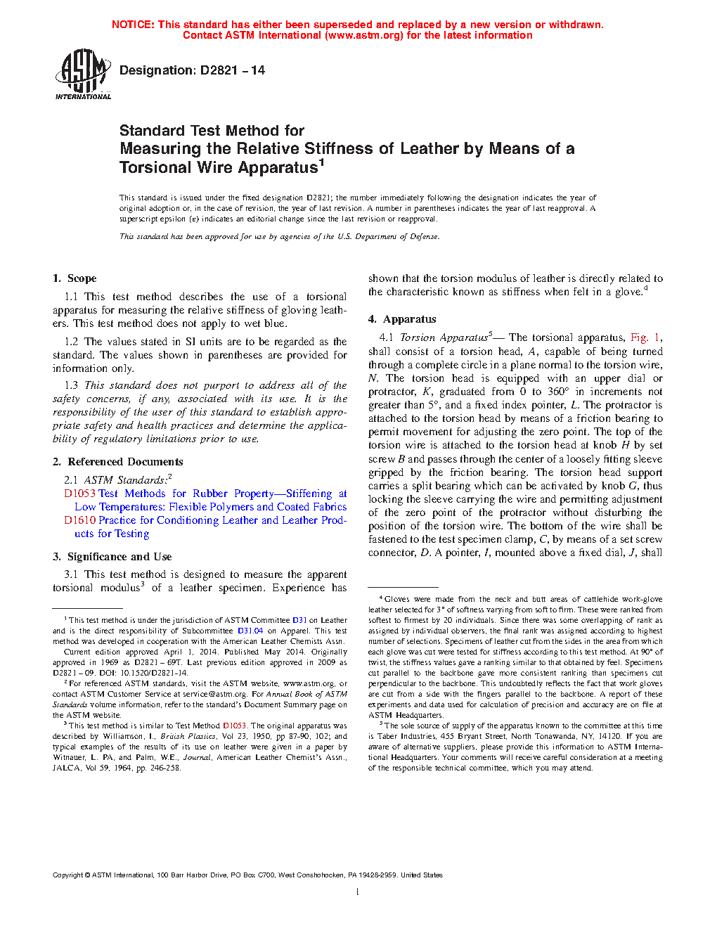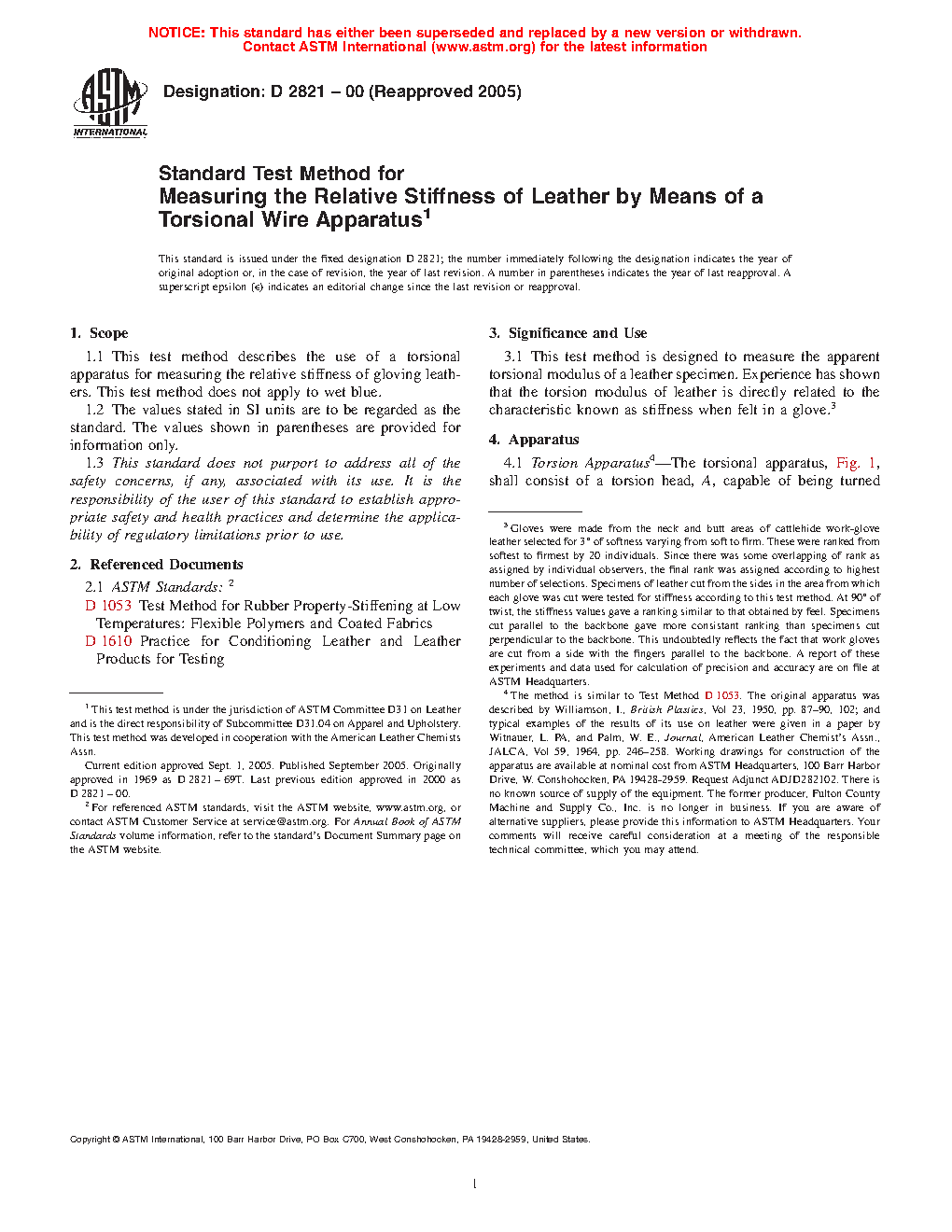 3.1 This test method is designed to measure the apparent torsional modulus3 of a leather specimen. Experience has shown that the torsion modulus of leather is directly related to the characteristic known as stiffness when felt in a glove.4