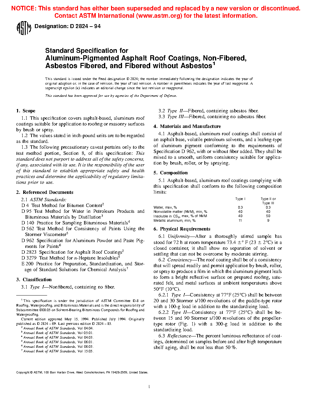 This specification covers three types of aluminum-pigmented asphalt roof coatings suitable for application to roofing or masonry surfaces by brush or spray. Type I is nonfibered, Type II is fibered with asbestos, and Type III is fibered other than asbestos. The coatings shall adhere to chemical requirements such as composition limits for water, nonvolatile matter, metallic aluminum, and insolubility in CS2. They shall also meet physical requirements as to uniformity, consistency, and luminous reflectance.
