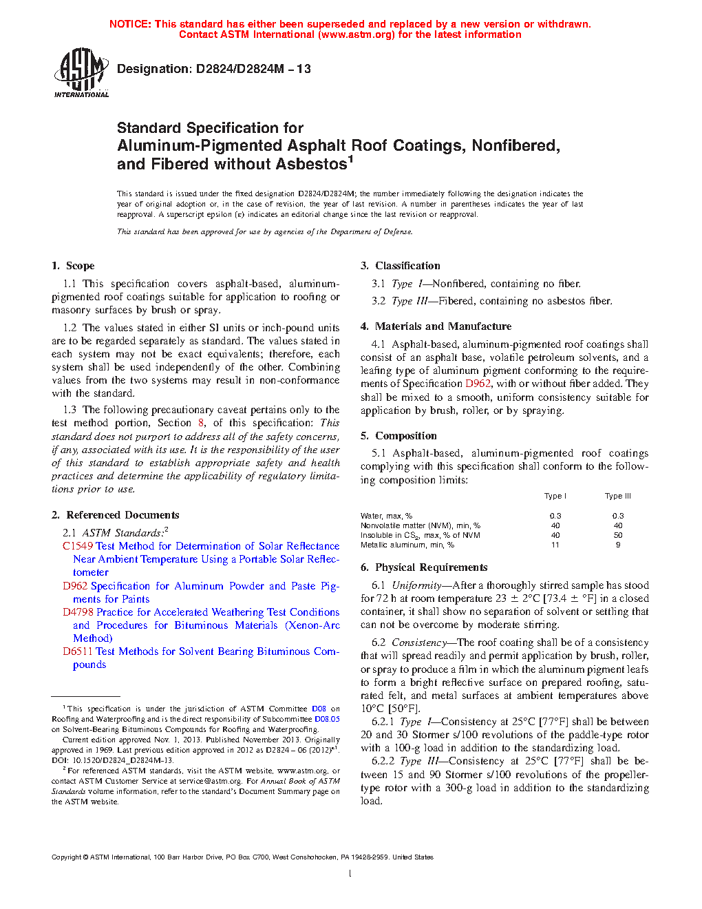 1.1 This specification covers asphalt-based, aluminum roof coatings suitable for application to roofing or masonry surfaces by brush or spray.