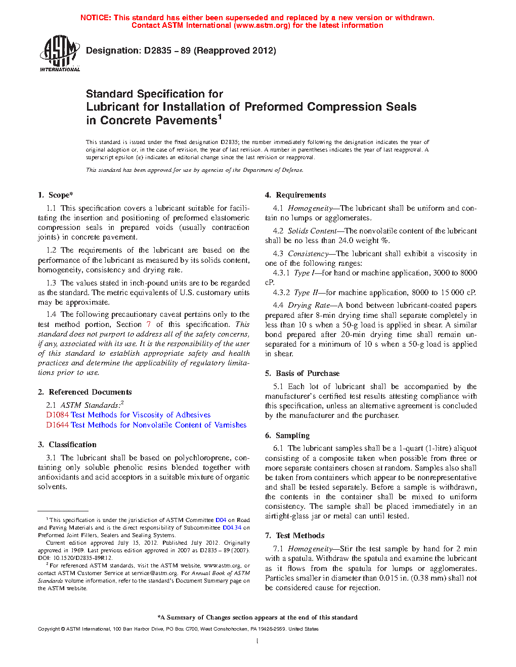 This specification covers a lubricant suitable for facilitating the insertion and positioning of preformed elastomeric compression seals in prepared voids (usually contraction joints) in concrete pavements. The lubricant shall be based on polychloroprene, containing only soluble phenolic resins blended together with antioxidants and acid acceptors in a suitable mixture of organic solvents. The requirements of the lubricant are based on the performance of the lubricant as measured by its solids content, homogeneity, consistency and drying rate.
