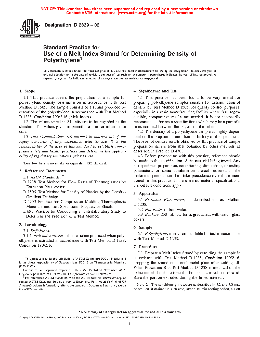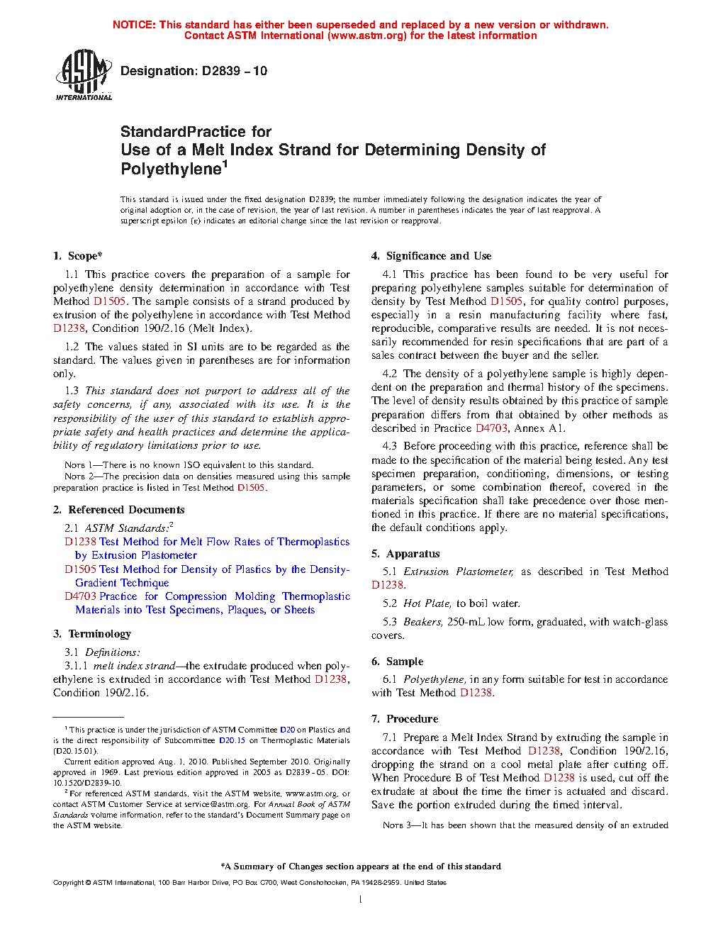 The density of a polyethylene sample is highly dependent on the preparation and thermal history of the specimens. The level of density results obtained by this practice of sample preparation differs from that obtained by other methods as described in Practice D 4703
