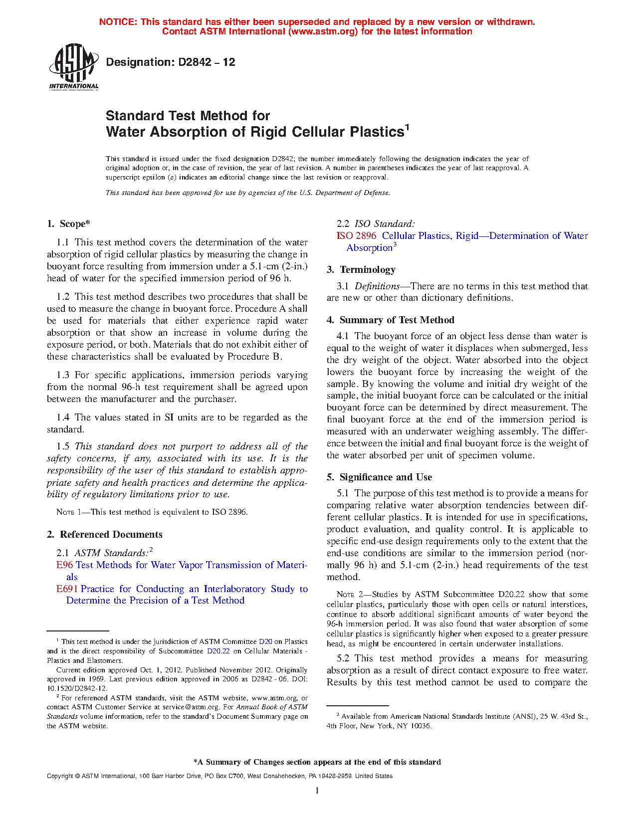 Note 2: Studies by ASTM Subcommittee D20.22 show that some cellular plastics, particularly those with open cells or natural interstices, continue to absorb additional significant amounts of water beyond the 96-h immersion period. It was also found that water absorption of some cellular plastics is significantly higher when exposed to a greater pressure head, as might be encountered in certain underwater installations.