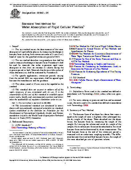 1.1 This test method covers the determination of the water absorption of rigid cellular plastics by measuring the change in buoyant force resulting from immersion under a 5.1-cm (2-in.) head of water for the specified immersion period of 96 h.