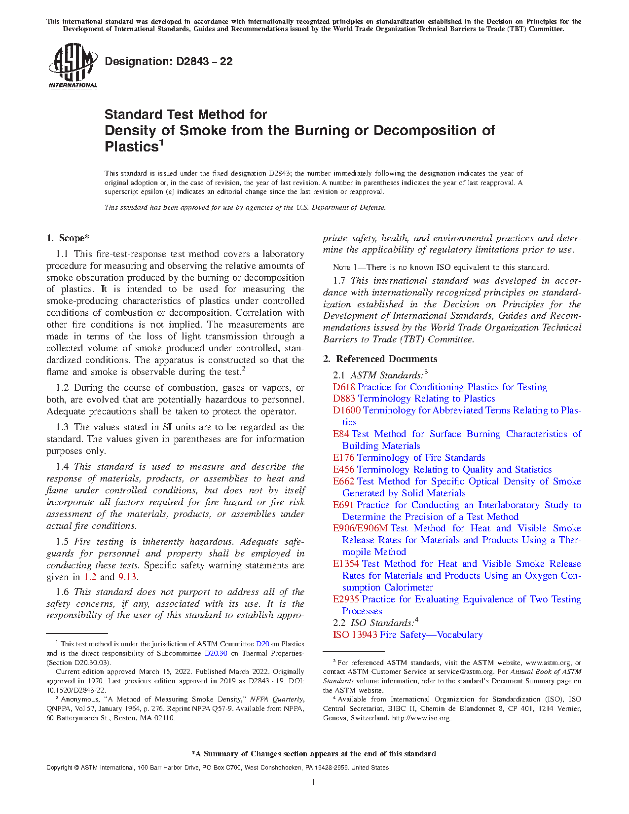 1.1 This fire-test-response test method covers a laboratory procedure for measuring and observing the relative amounts of smoke obscuration produced by the burning or decomposition of plastics. It is intended to be used for measuring the smoke-producing characteristics of plastics under controlled conditions of combustion or decomposition. Correlation with other fire conditions is not implied. The measurements are made in terms of the loss of light transmission through a collected volume of smoke produced under controlled, standardized conditions. The apparatus is constructed so that the flame and smoke can be observed during the test.