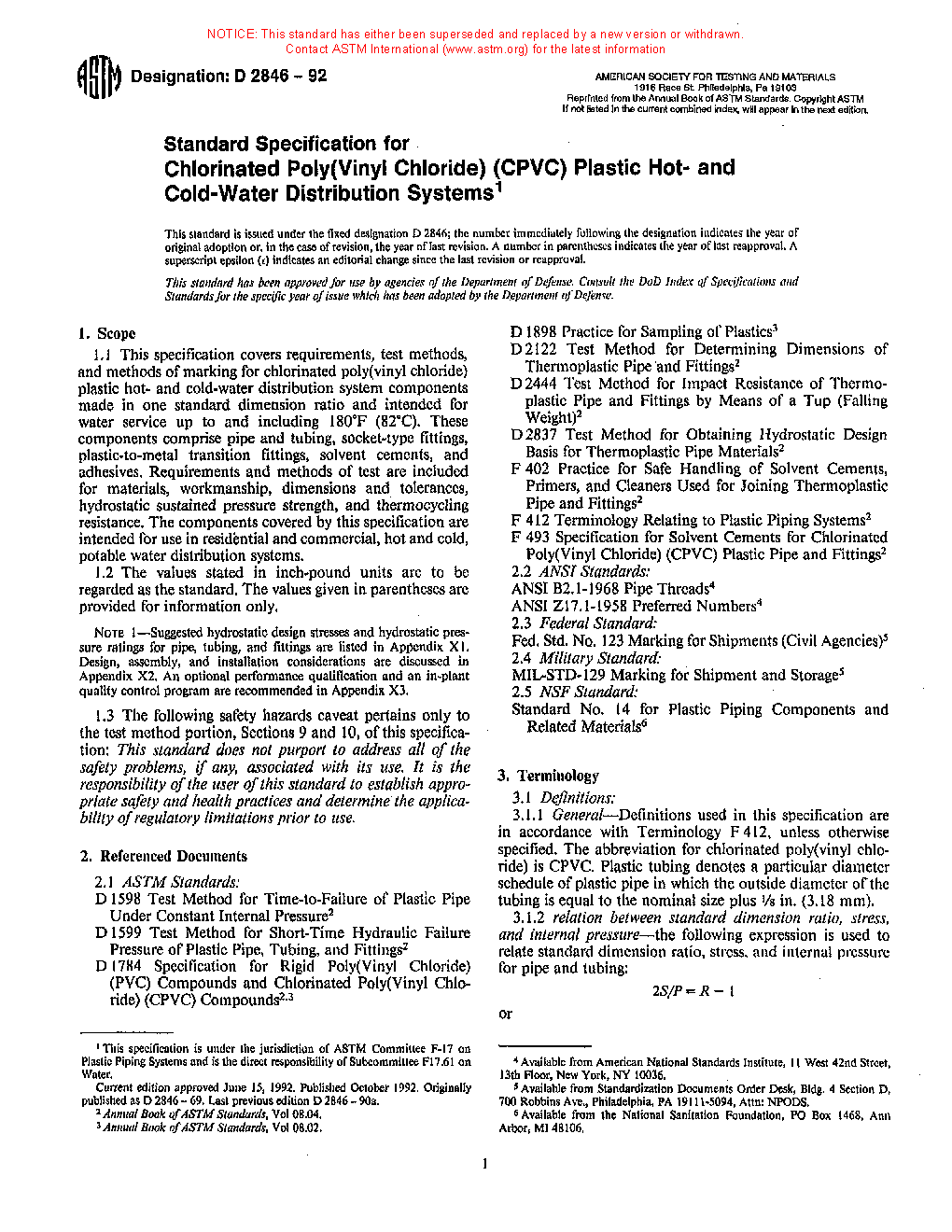 Standard Specification for Chlorinated Poly(Vinyl Chloride) (CPVC) Plastic Hot- and Cold-Water Distribution Systems