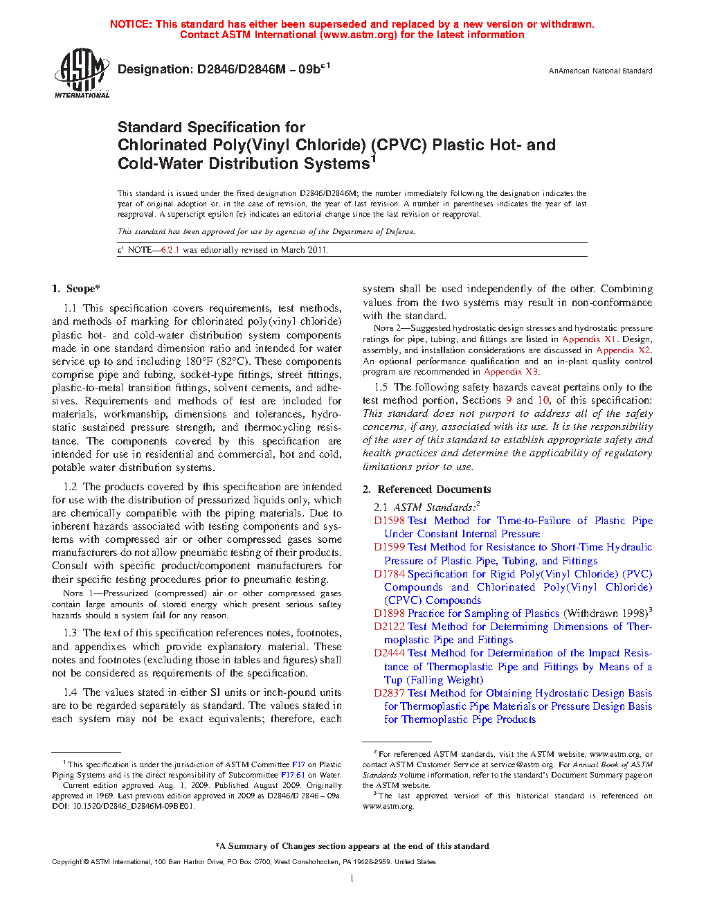 1.1 This specification covers requirements, test methods, assembly, and methods of marking for chlorinated poly(vinyl chloride) plastic hot- and cold-water distribution system components made in one standard dimension ratio and intended for water service up to and including 180 °F (82 °C). These components comprise pipe and tubing, socket-type fittings, street fittings, plastic-to-metal transition fittings, solvent cements, and adhesives. Requirements and methods of test are included for materials, workmanship, dimensions and tolerances, hydrostatic sustained pressure strength, and thermocycling resistance. The components covered by this specification are intended for use in residential and commercial, hot and cold, potable water distribution systems.