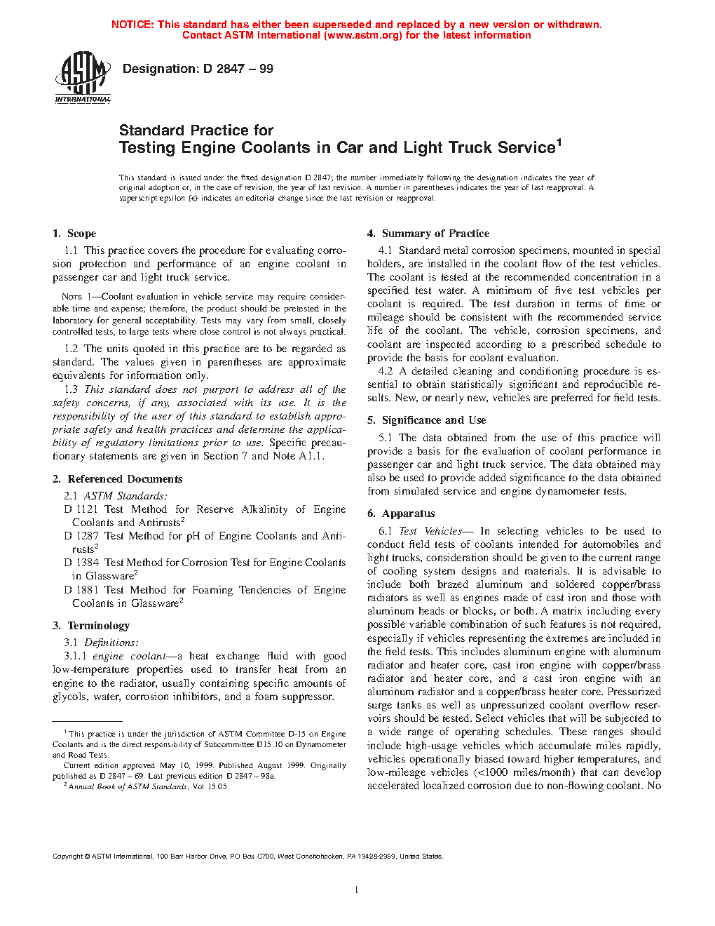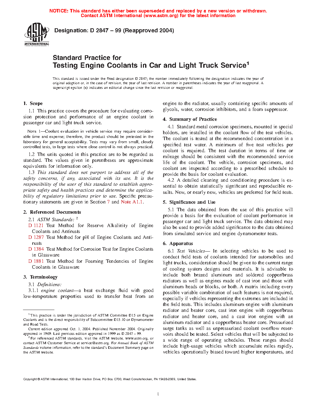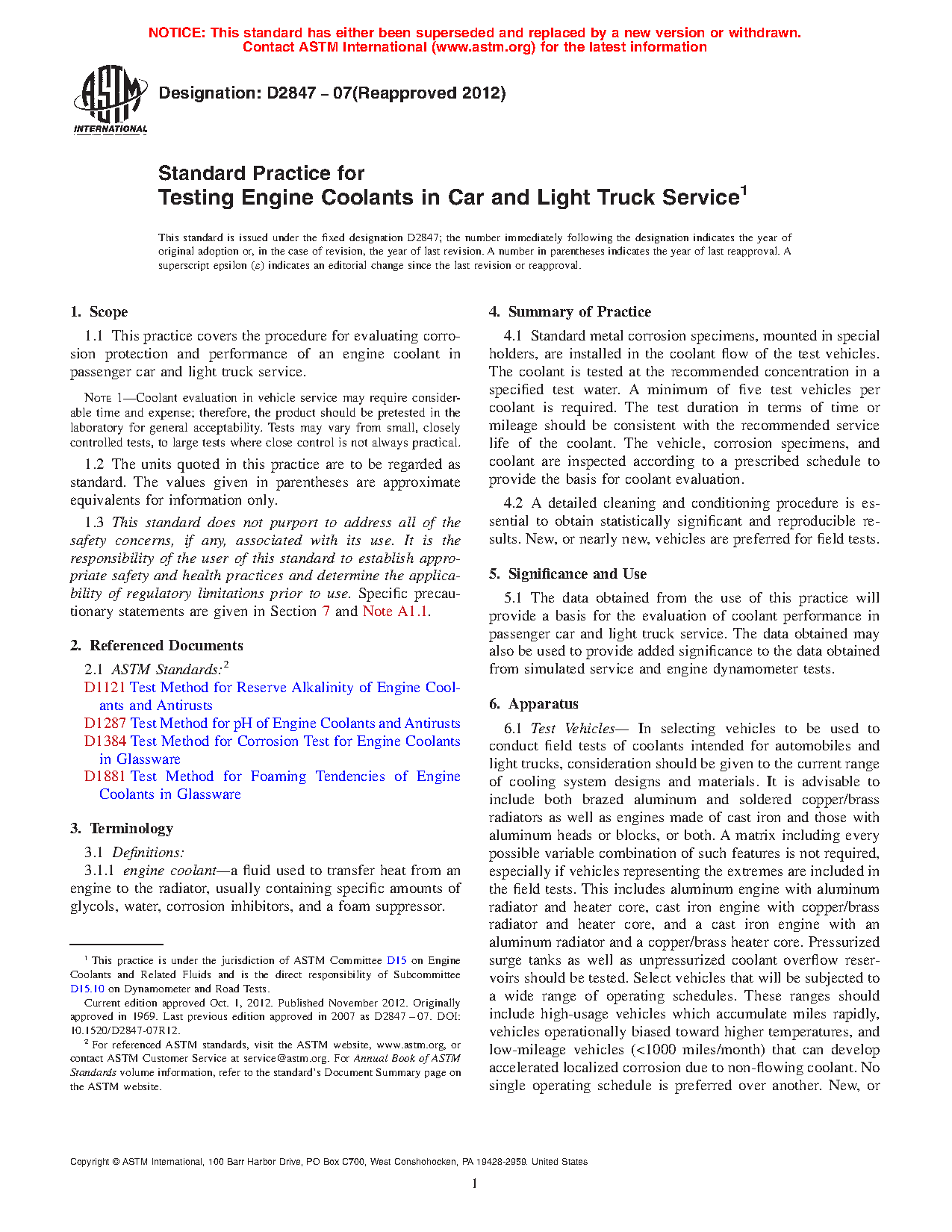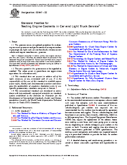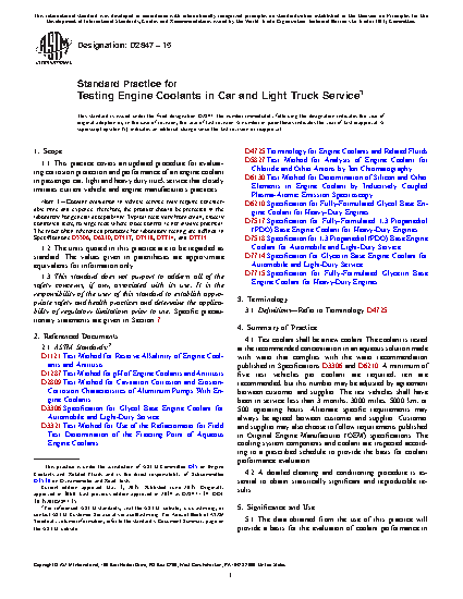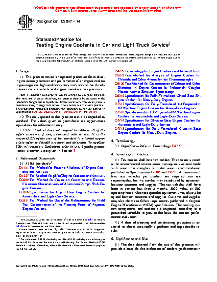 1.1 This practice covers an updated procedure for evaluating corrosion protection and performance of an engine coolant in passenger car, light and heavy duty truck service that closely imitates current vehicle and engine manufacturers practices.