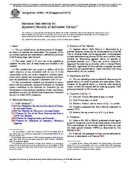 1.1 This test method covers the determination of the apparent density of granular activated carbon. For purposes of this test method, granular activated carbon is defined as a minimum of 90 % being larger than 80 mesh.