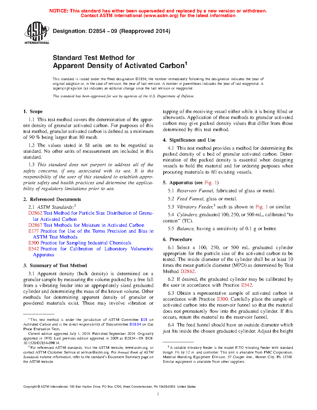 4.1 This test method provides a method for determining the packed density of a bed of granular activated carbon. Determination of the packed density is essential when designing vessels to hold the material and for ordering purposes when procuring materials to fill existing vessels.
