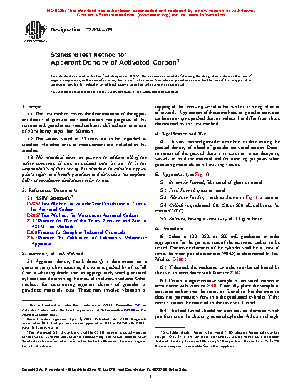 1.1 This test method covers the determination of the apparent density of granular activated carbon. For purposes of this test method, granular activated carbon is defined as a minimum of 90 % being larger than 80 mesh.