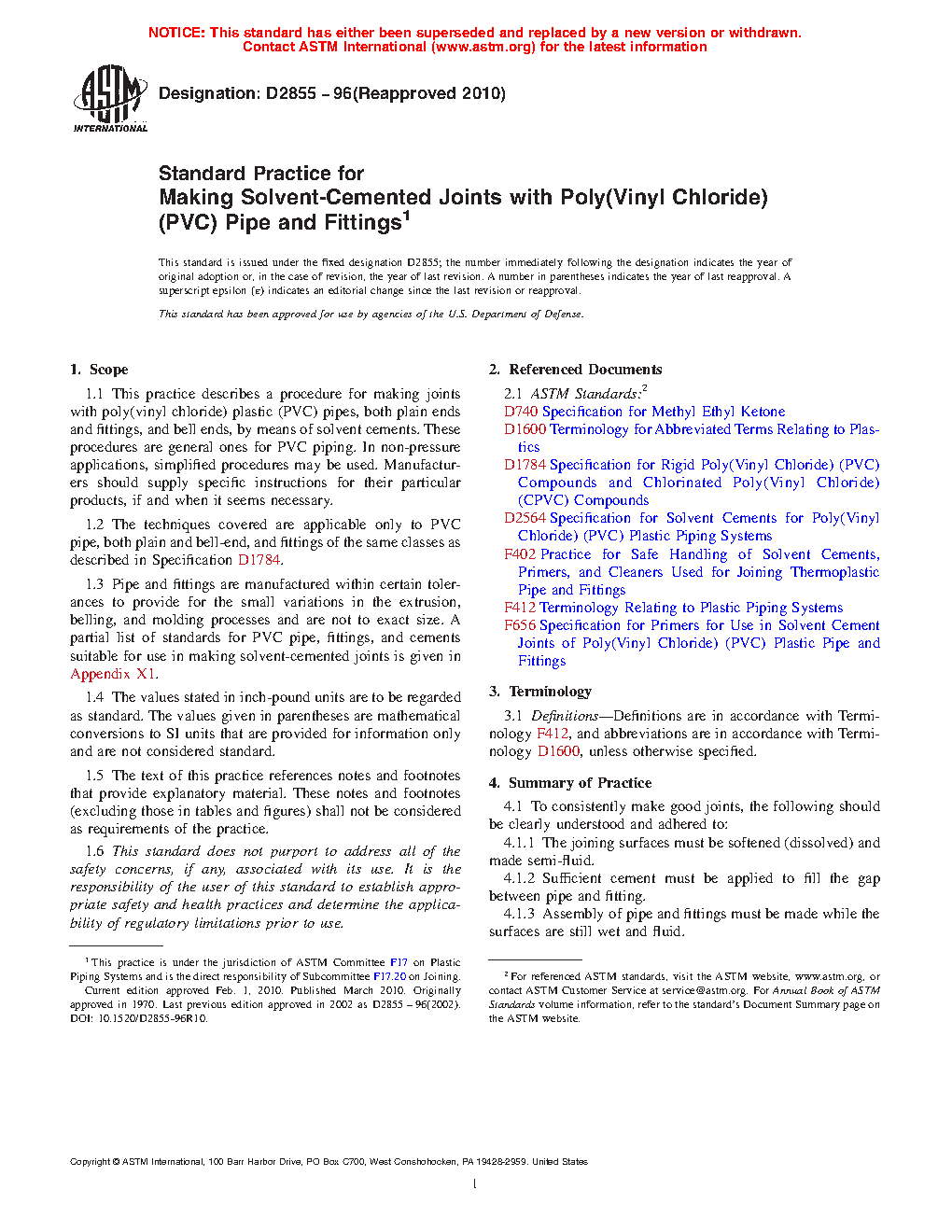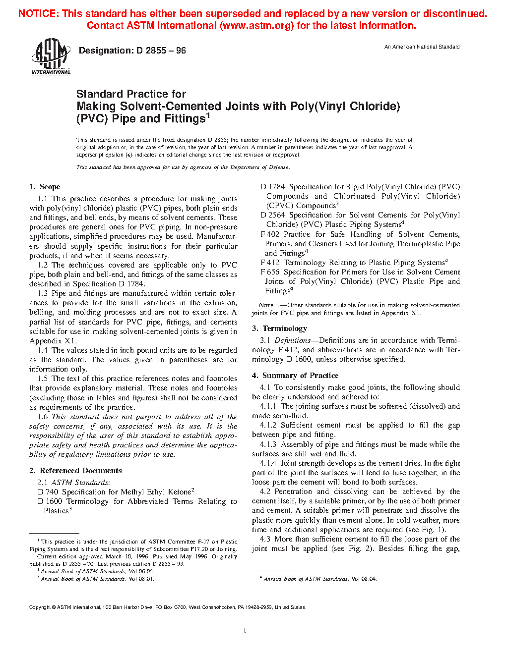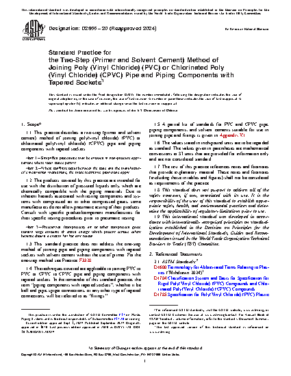 1.1 This practice describes a two-step (primer and solvent cement) method of joining poly(vinyl chloride) (PVC) or chlorinated poly(vinyl chloride) (CPVC) pipe and piping components with tapered sockets.