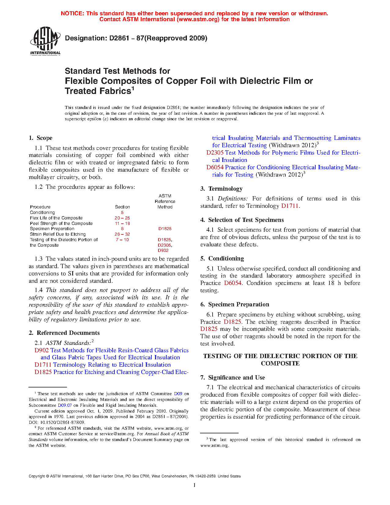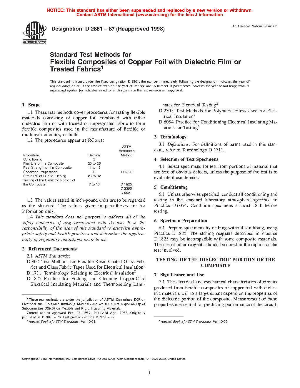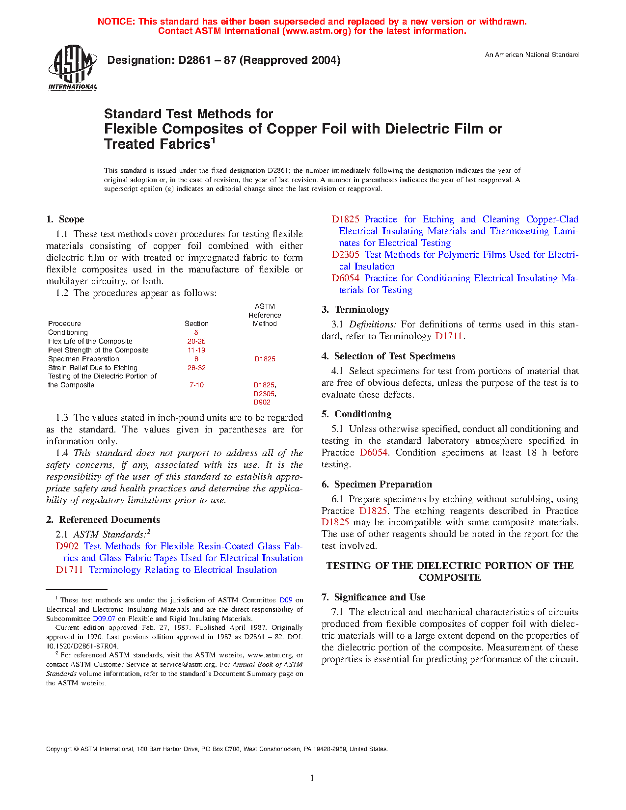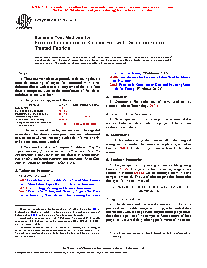1.1 These test methods cover procedures for testing flexible materials consisting of copper foil combined with either dielectric film or with treated or impregnated fabric to form flexible composites used in the manufacture of flexible or multilayer circuitry, or both.