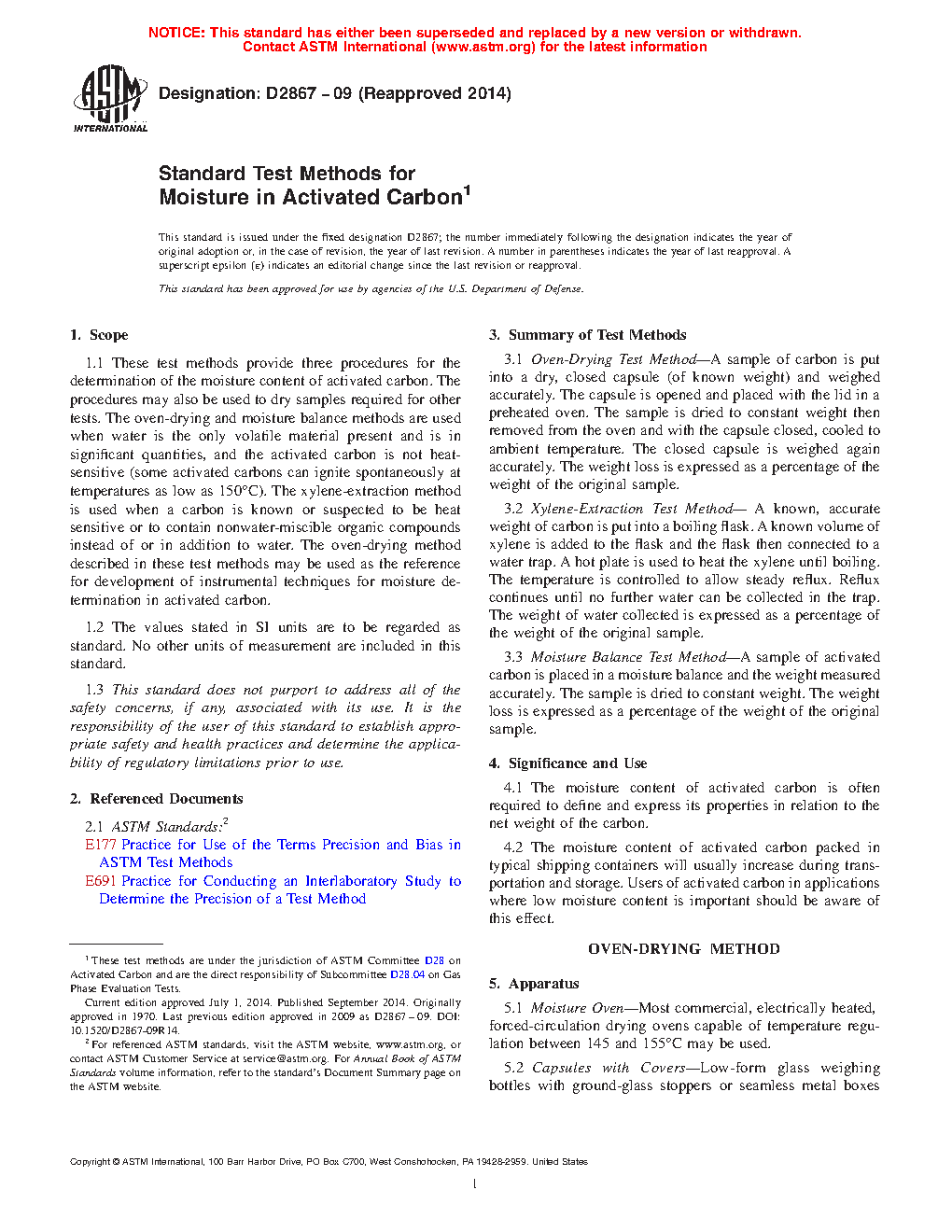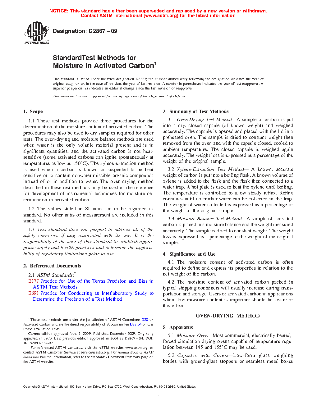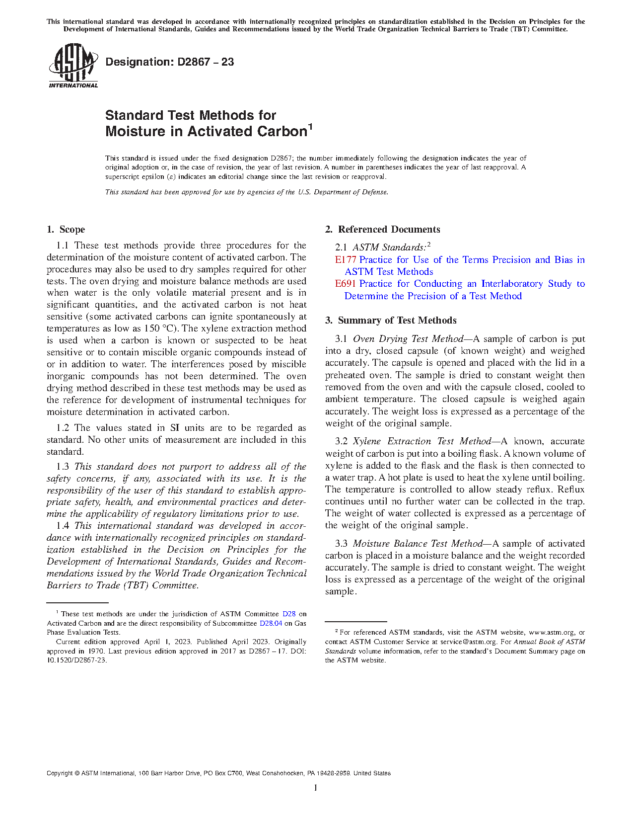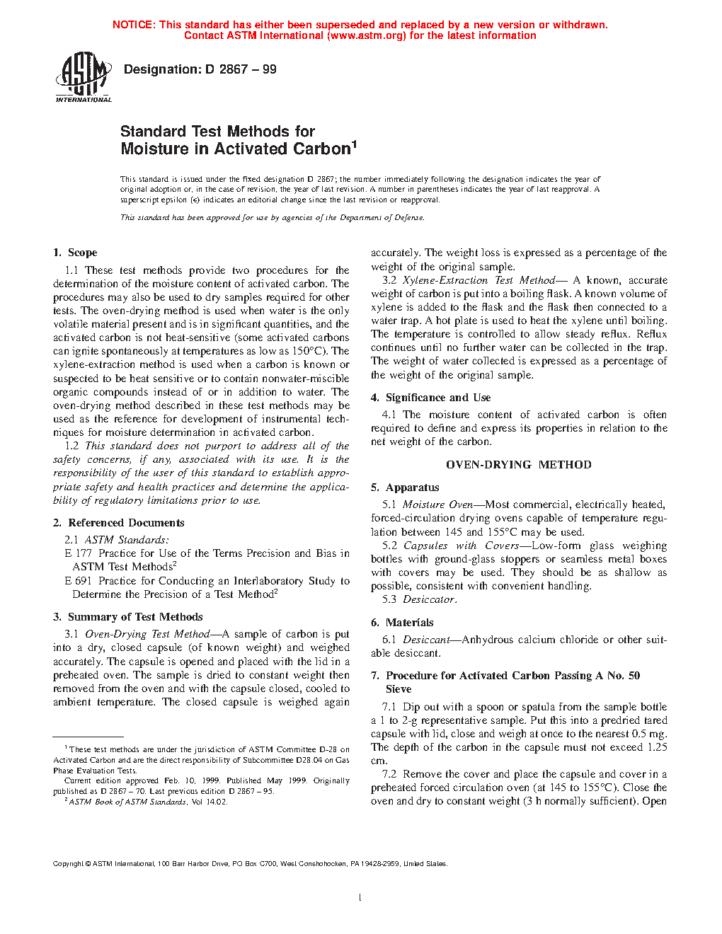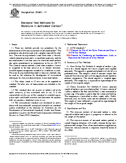 1.1 These test methods provide two procedures for the determination of the moisture content of activated carbon.2 The procedures may also be used to dry samples required for other tests. The oven drying method is used when water is the only volatile material present and is in significant quantities, and the activated carbon is not heat sensitive (some activated carbons can ignite spontaneously at temperatures as low as 150 °C). The xylene extraction method is used when a carbon is known or suspected to be heat sensitive or to contain nonwater-miscible organic compounds instead of or in addition to water. The oven drying method described in these test methods may be used as the reference for development of instrumental techniques for moisture determination in activated carbon.