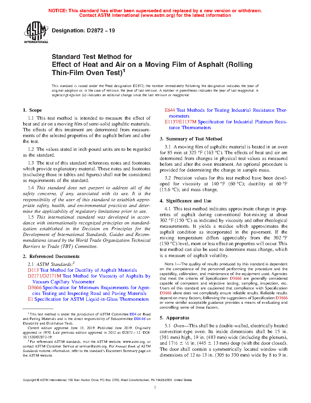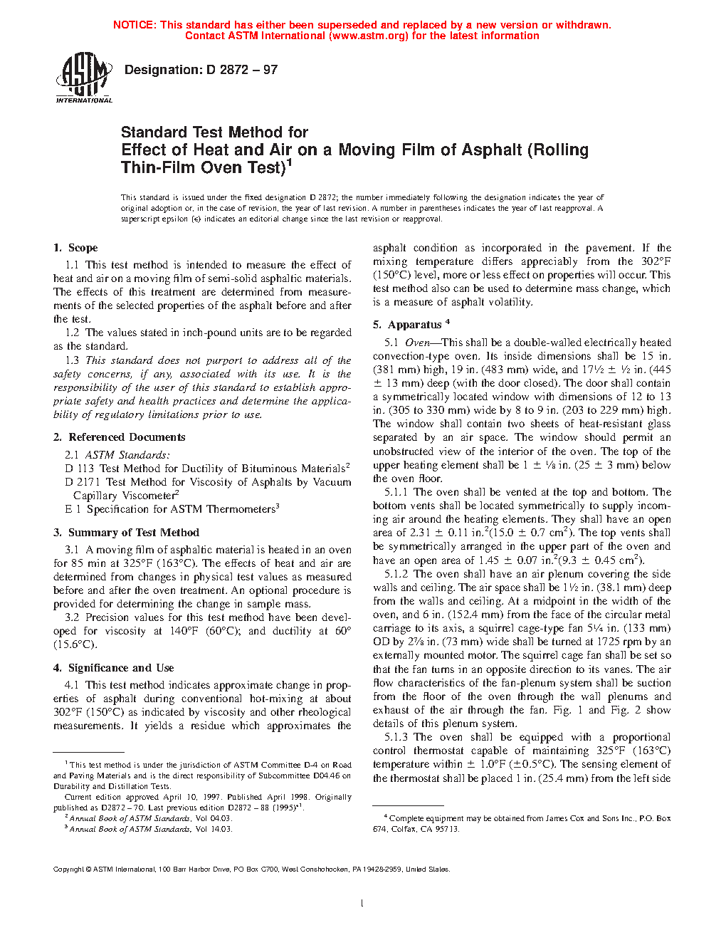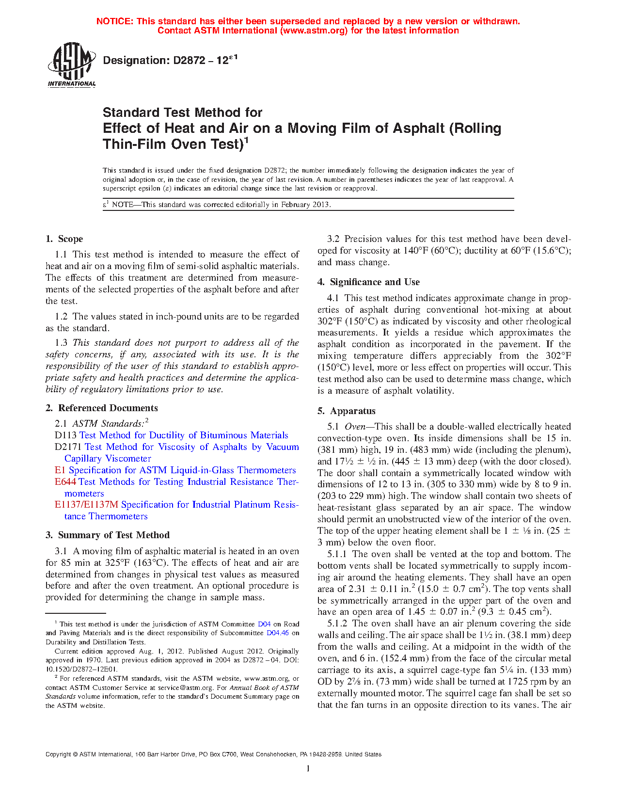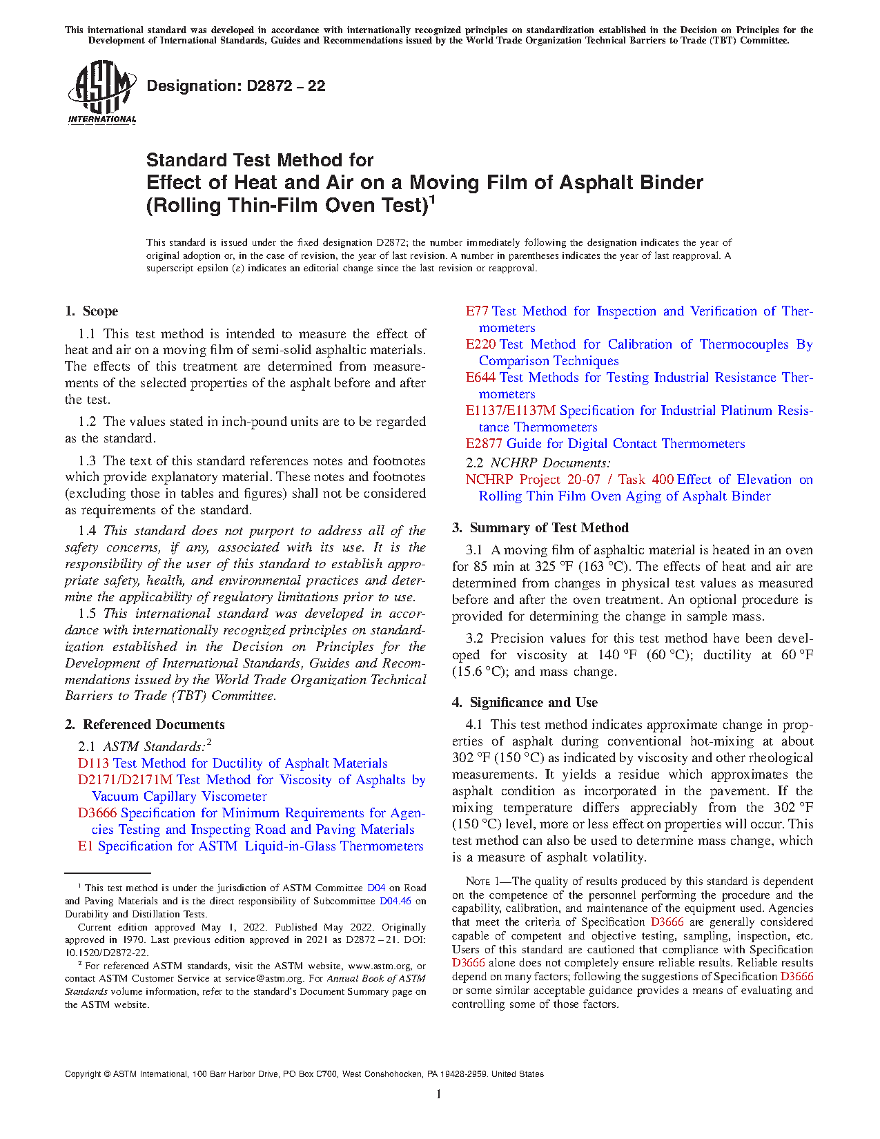 1.1 This test method is intended to measure the effect of heat and air on a moving film of semi-solid asphaltic materials. The effects of this treatment are determined from measurements of the selected properties of the asphalt before and after the test.