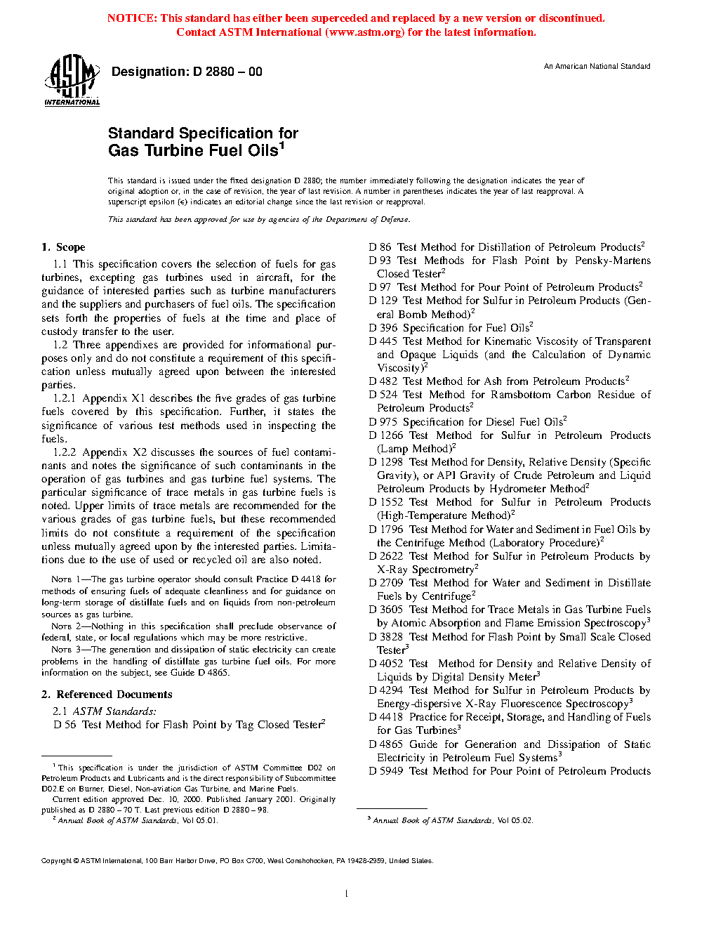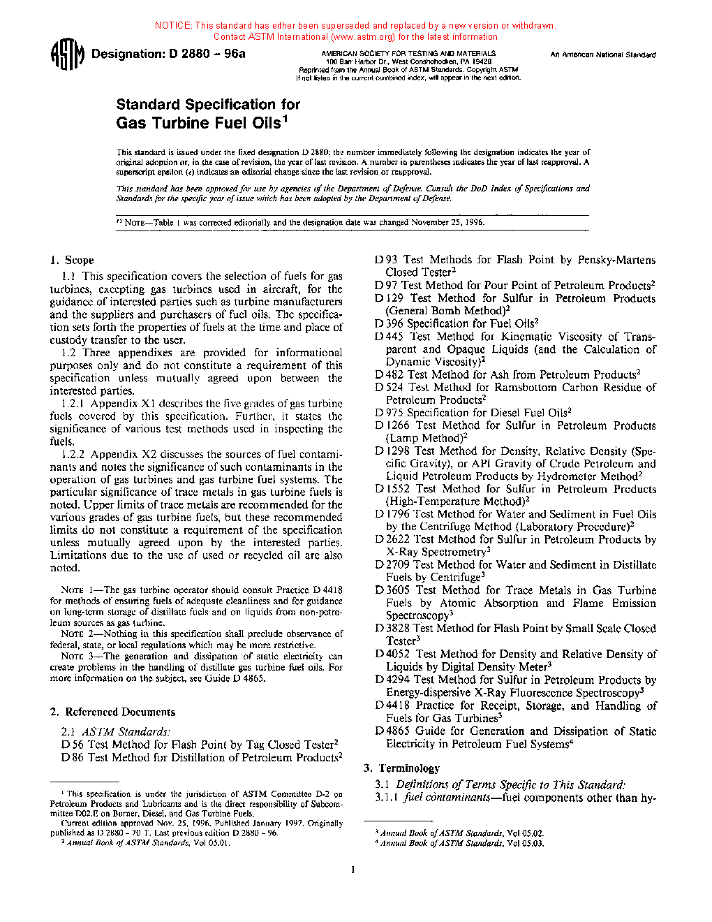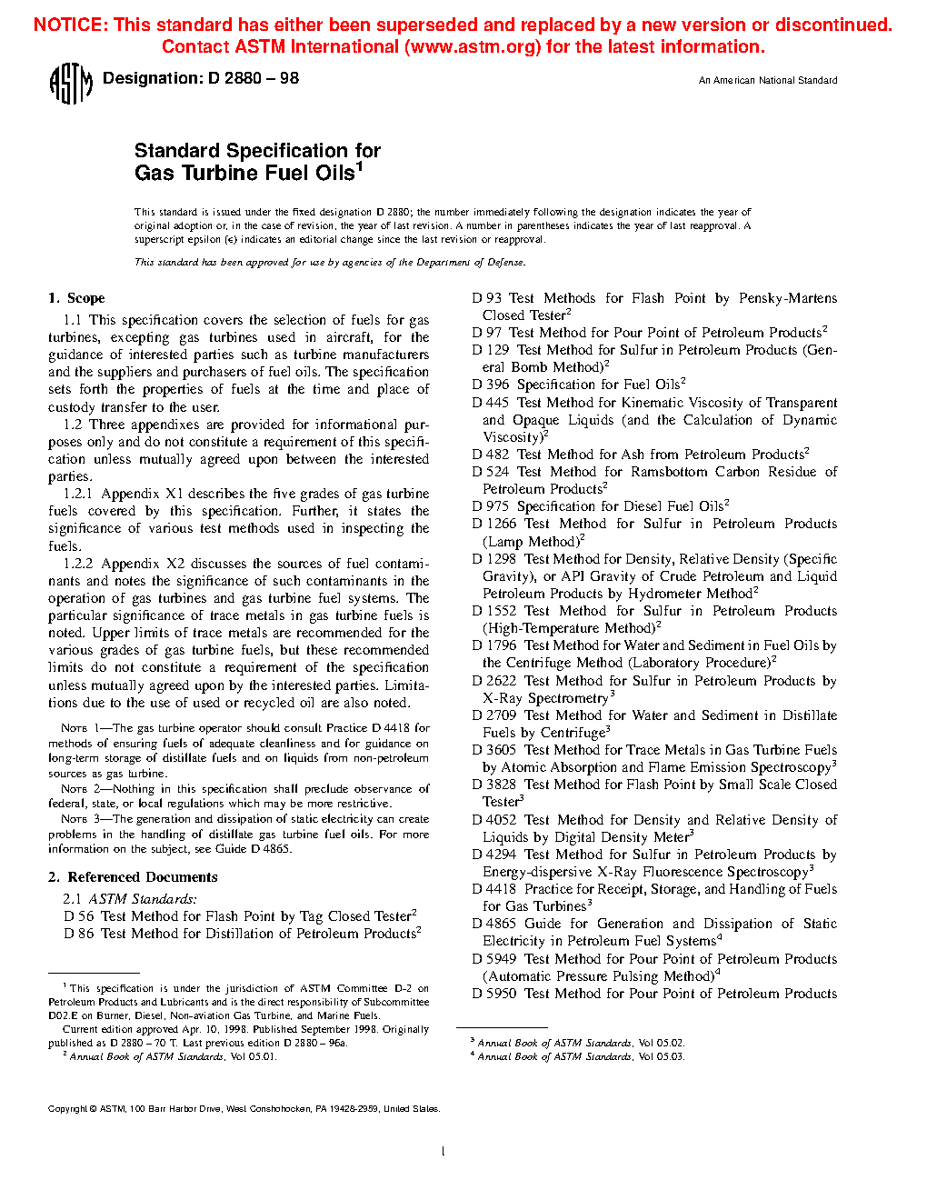 This specification covers the selection of fuels for gas turbines, excepting gas turbines used in aircraft, for the guidance of interested parties such as turbine manufacturers and the suppliers and purchasers of fuel oils. The specification sets forth the properties of fuels at the time and place of custody transfer to the user. The fuels shall be homogeneous mixtures of hydrocarbon oils free of inorganic acid, and free of excessive amounts of solid or fibrous foreign matter likely to make frequent cleaning of suitable strainers necessary. All grades containing residual components shall remain homogeneous in normal storage and not separated by gravity into light and heavy oil components outside the viscosity limits for the grade. The following test methods shall be performed to determine certain properties: flash point test, pour point test, water and sediment test, carbon residue test, ash test, distillation test, viscosity test, density test, and sulfur test.