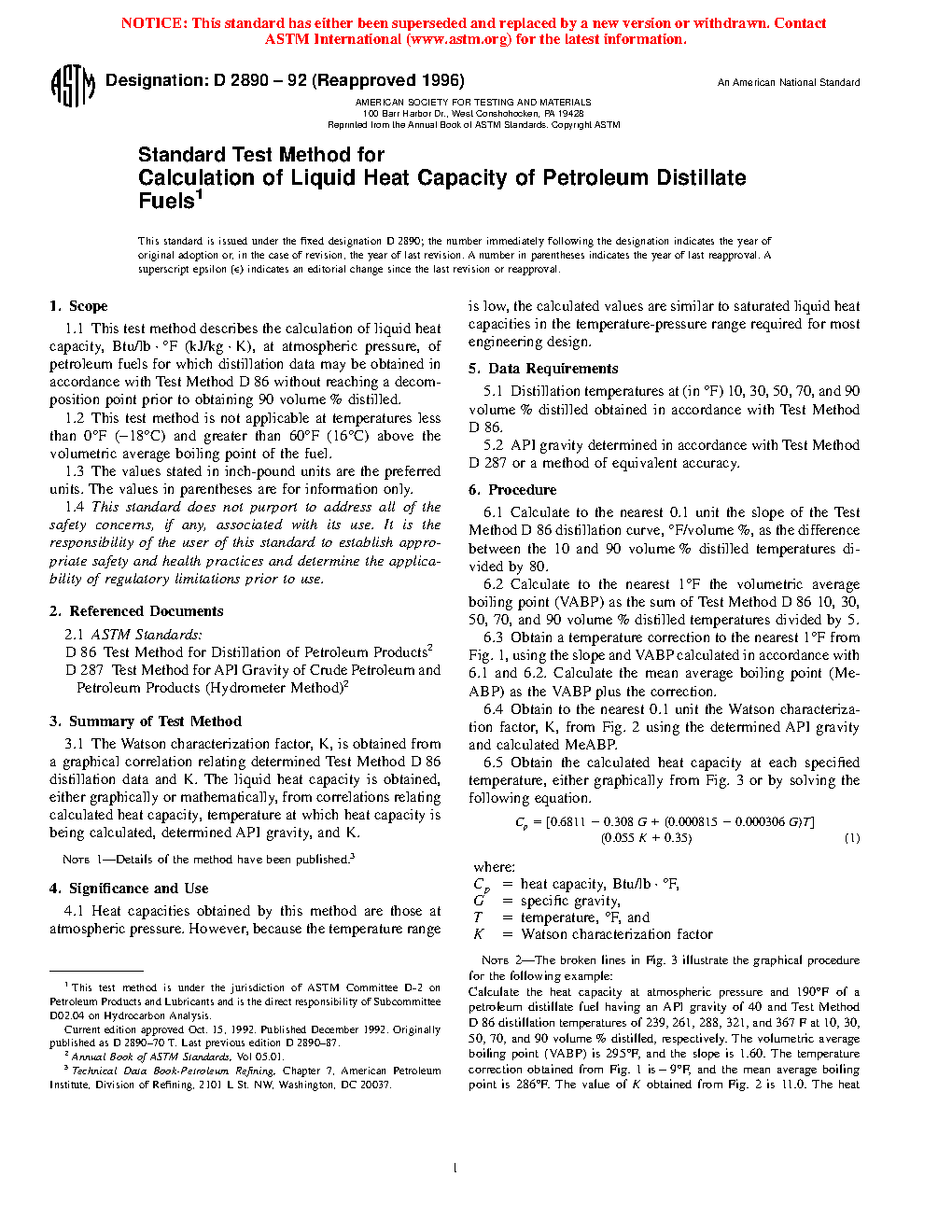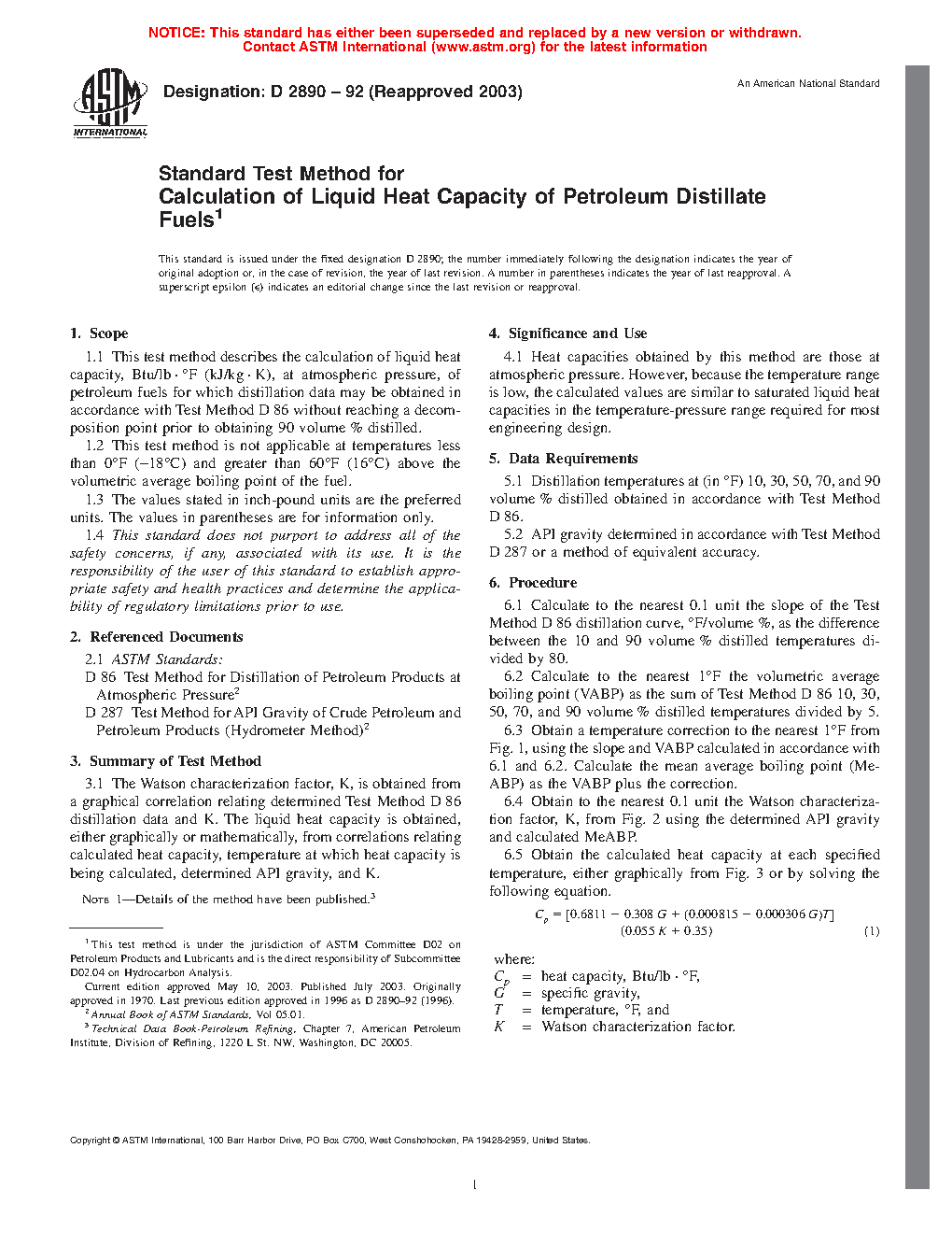 1.1 This test method covers the calculation of liquid heat capacity, Btu/lb · °F (kJ/kg · K), at atmospheric pressure, of petroleum fuels for which distillation data may be obtained in accordance with Test Method D86 without reaching a decomposition point prior to obtaining 90 % by volume distilled.