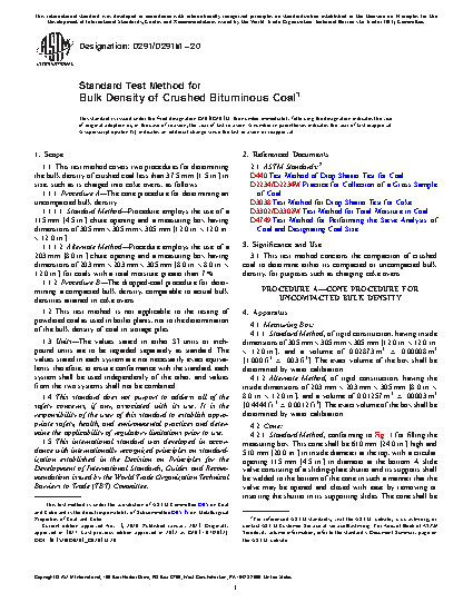 1.1 This test method covers two procedures for determining the bulk density of crushed coal less than 37.5 mm [1.5 in.] in size, such as is charged into coke ovens, as follows: