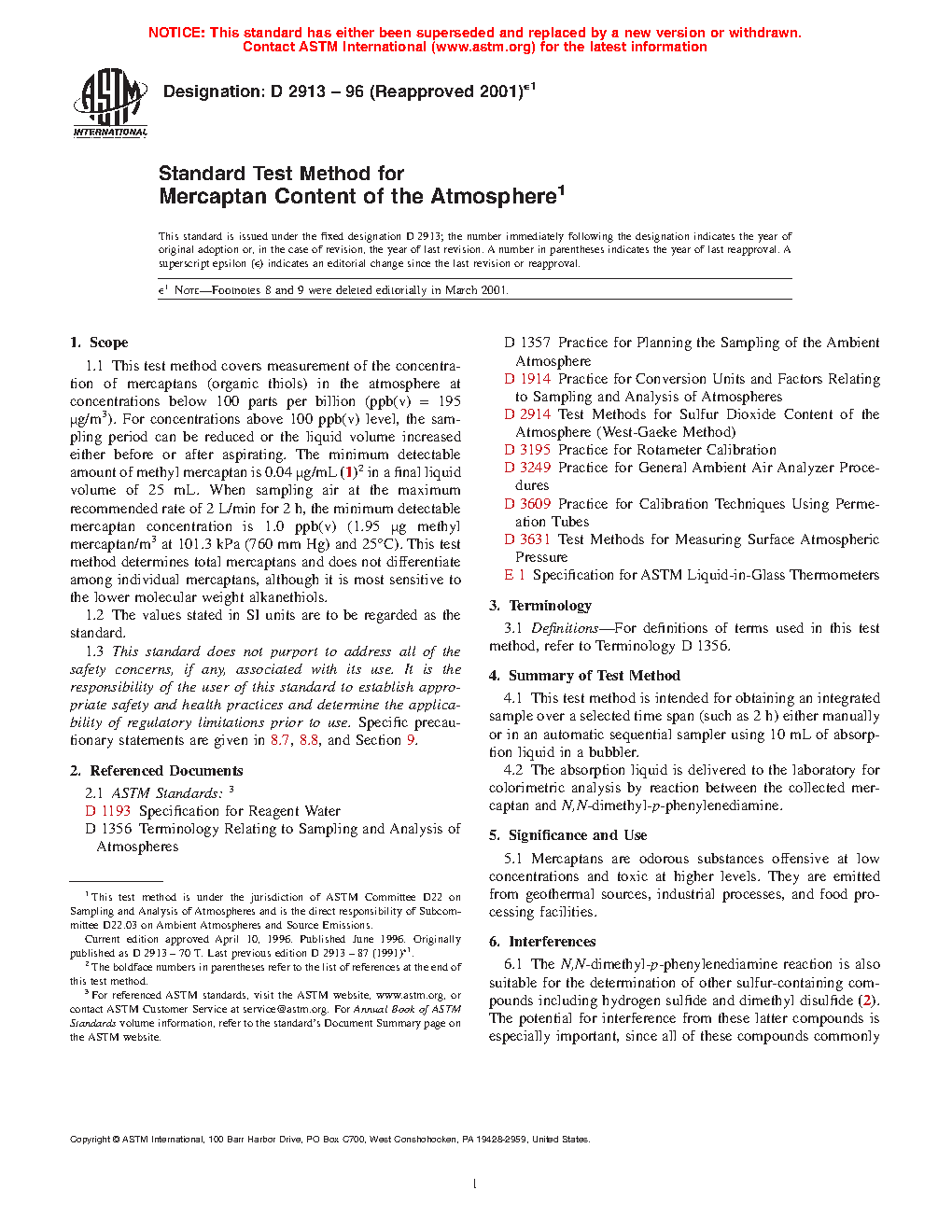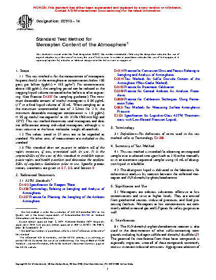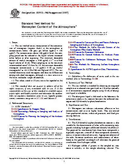 1.1 This test method is for the measurement of mercaptans (organic thiols) in the atmosphere at concentrations below 100 parts per billion (ppb(v) = 195 μg/m3). For concentrations above 100 ppb(v), the sampling period can be reduced or the trapping liquid volume increased either before or after aspirating. (See Practice D1357 for sampling guidance.) The minimum detectable amount of methyl mercaptan is 0.04 μg/mL (1)2 in a final liquid volume of 25 mL. When sampling air at the maximum recommended rate of 2 L/min for 2 h, the minimum detectable mercaptan concentration is 1.0 ppb(v) (1.95 μg methyl mercaptan/m3 at 101.3 kPa (760 mm Hg) and 25°C). This test method determines total mercaptans and does not differentiate among individual mercaptans, although it is most sensitive to the lower molecular weight alkanethiols.