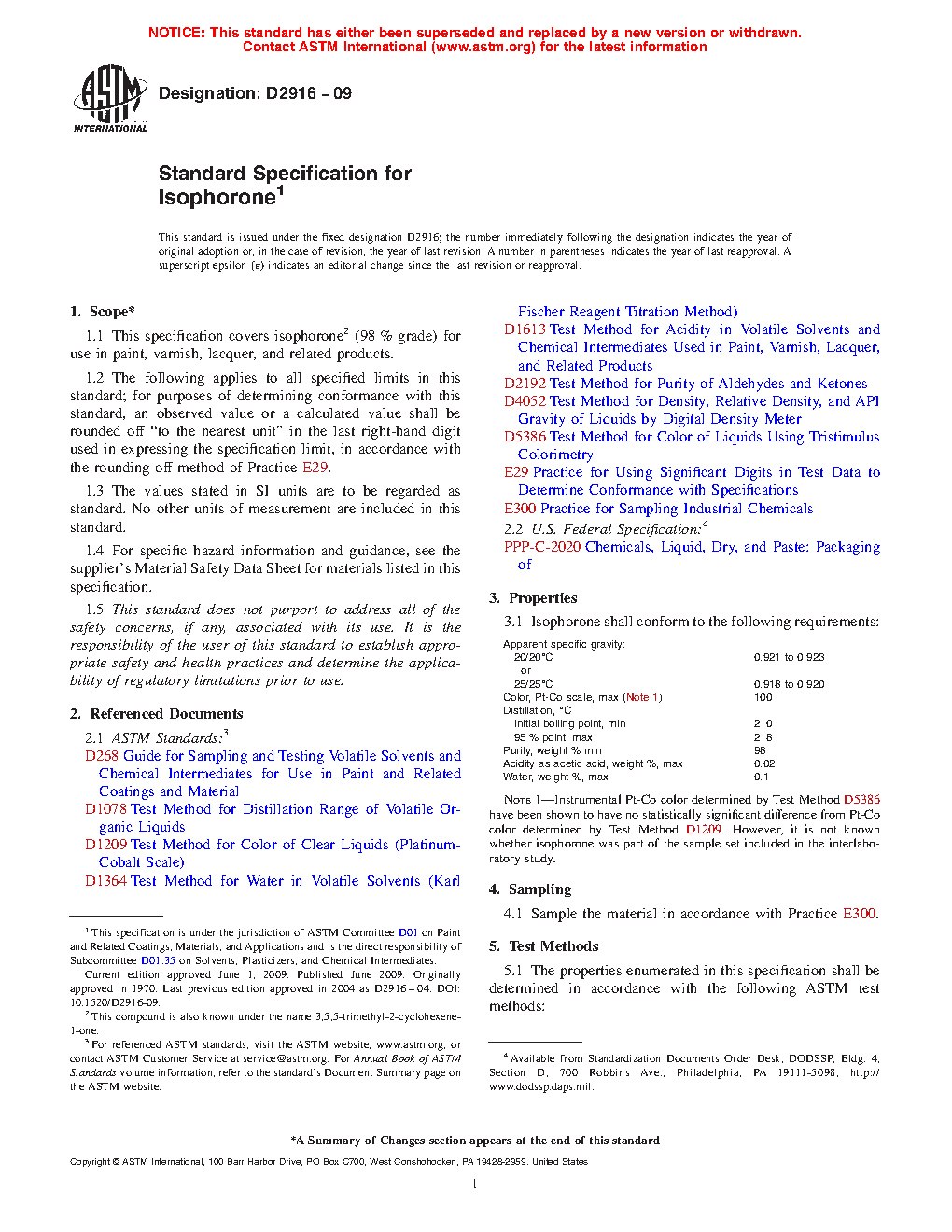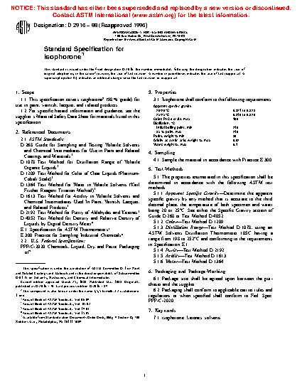 1.1 This specification covers isophorone (98 % grade) for use in paint, varnish, lacquer, and related products.