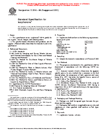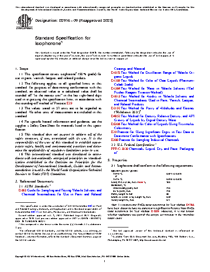 This specification covers isophorone volatile solvents used in paints, varnishes, lacquers, and related products. Isoprophone should conform to the specified requirements on apparent specific gravity, color, distillation, purity, acidity as acetic acid, and water content.